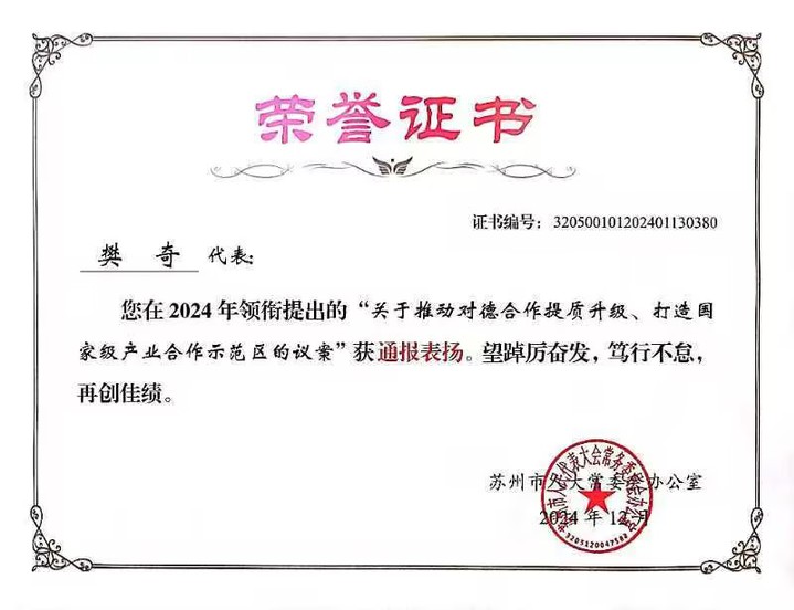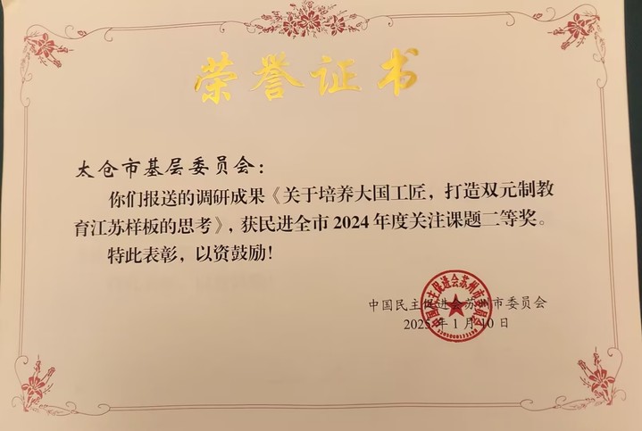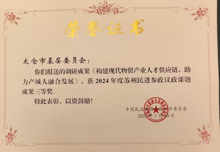 经济管理学院樊奇院长“关于推动对德合作提质升级、打造国家级产业合作示范区的议案”获苏州市人大常委会通报表扬,调研成果《关于培养大国工匠,打造双元制教育江苏样板的思考》获民进全市2024年度关注课题二等奖。朱溪亭老师的《构建现代物贸产业人才供应链,助力产城人融合发展》获2024年度苏州民进参政议政课题成果三等奖,《打造苏州特色现代职业教育体系,推进职业教育高质量发展》获太仓市各民主党派、统战团体领题调研优秀成果三等奖。杨琳华老师积极参政议政,荣获九三学社苏州市级优秀社员。