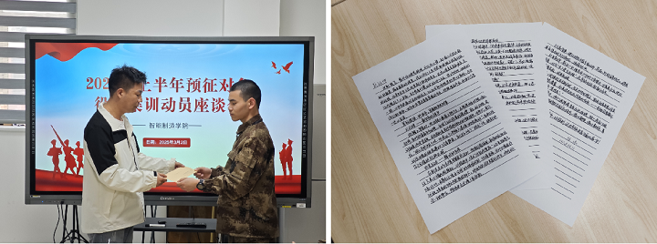 温情送别励壮志,深情寄语砺兵心。为勉励即将踏上役前训练征程的学子,智能制造学院于3月2日下午在东校区D1-203会议室召开2025年上半年预征对象役前集训动员座谈会。学院团总支书记徐炜、征兵专员刘家铭出席活动,为6名参训学员加油鼓劲,为他们即将开启的军旅生涯铺好坚实的基石。