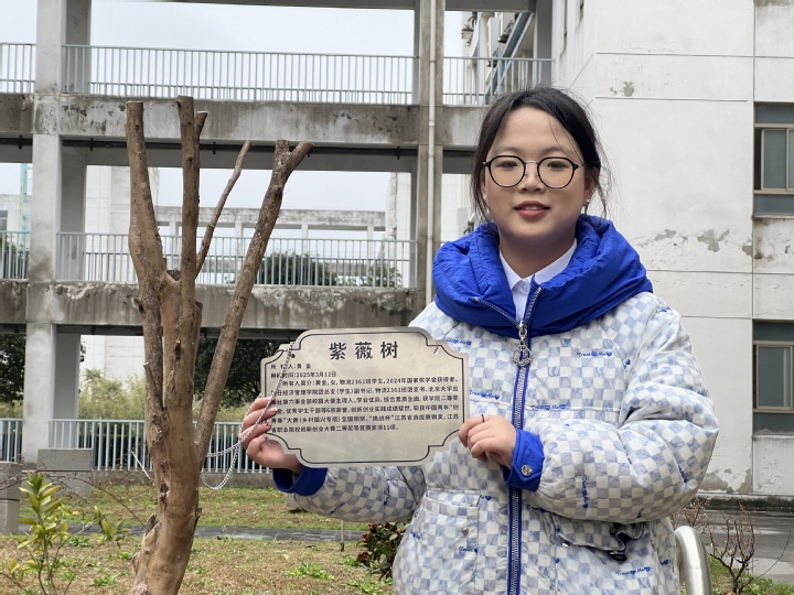 活动现场,师生们热情高涨,学院为每一位国家奖学金获得者赠送一棵紫薇树。八位国家奖学金获得者挥锹培土,种下象征荣誉传承的紫薇树。每棵树上悬挂的定制铭牌格外醒目,记录着八位优秀学子在校期间获得的奖项及荣誉。“紫薇树十年成材的特性,正与我们追求卓越的学术精神相通。”2024年国奖得主黄金同学轻抚树干感慨道。在场学生代表在紫薇树前驻足,仔细端详铭牌,了解获奖者的成长故事。