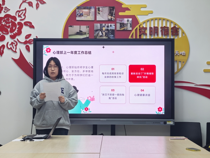 会议伊始,宋雨真同学对过去一学期开展的多项心理健康活动进行了全面总结。从“每月周报表”的精准记录,到“坏情绪粉碎机”的互动体验;从“防艾不放爱”的公益倡导,再到“心理健康讲座”的知识普及,每一场活动都凝聚着心理委员们的辛勤付出与智慧汗水。
