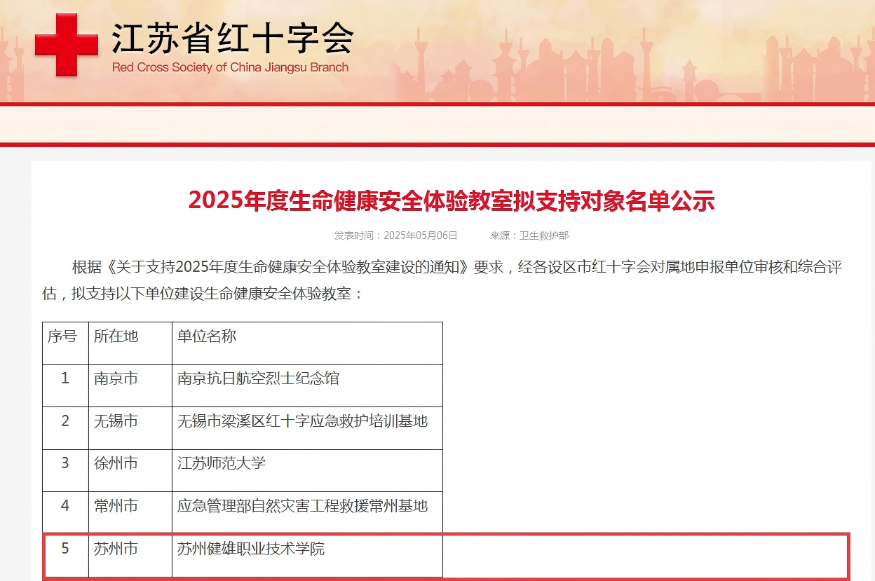 近日,我院成功入选江苏省红十字会“2025年度生命健康安全体验教室支持项目”,全省共有13个单位获批,我院成为苏州地区获此支持的唯一高校。