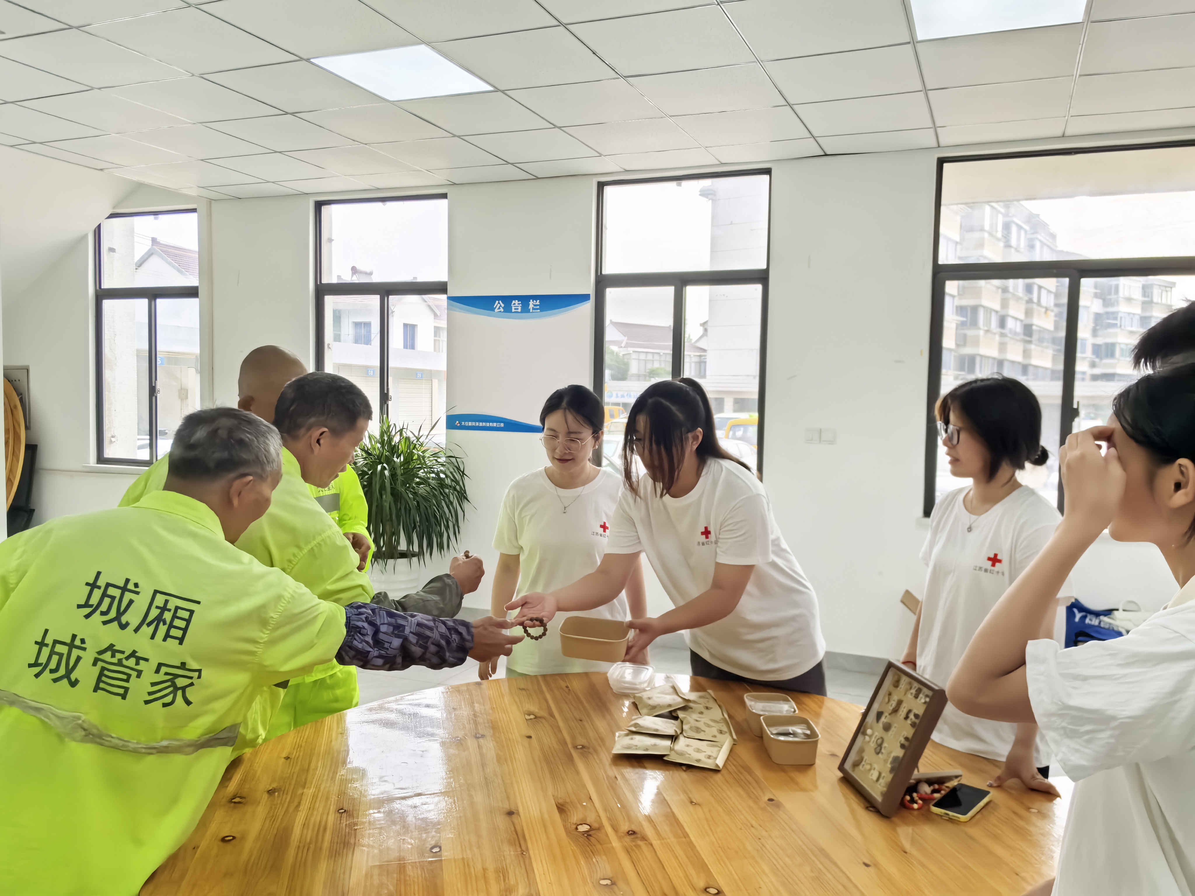 7月19日,正值三伏天高温预警频发之际,“本草承脉 青囊护行”服务团团队成员为80余名环卫工人送上中药防暑知识科普及自制中药手串,以中医药智慧为城市“美容师”筑起健康防线。