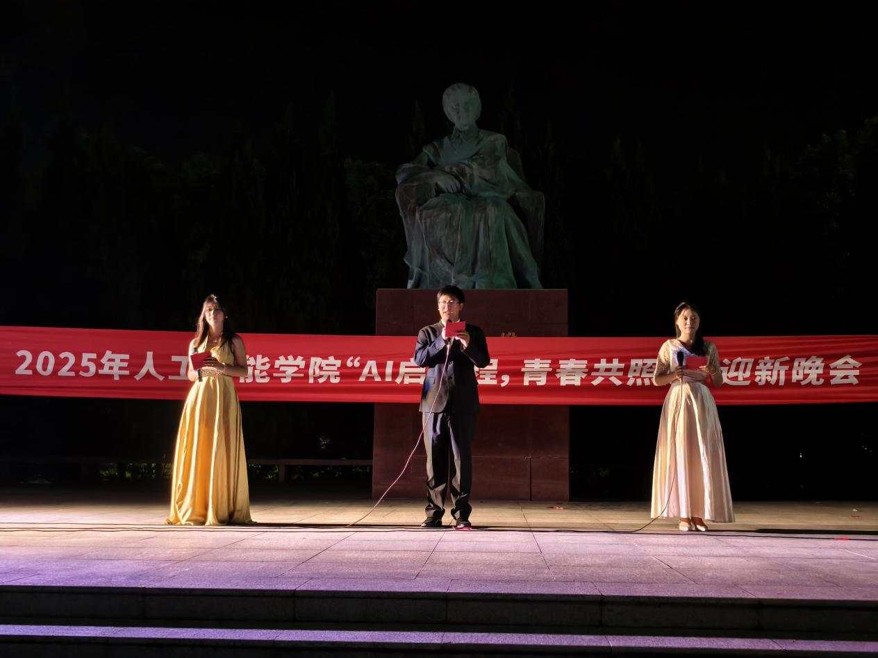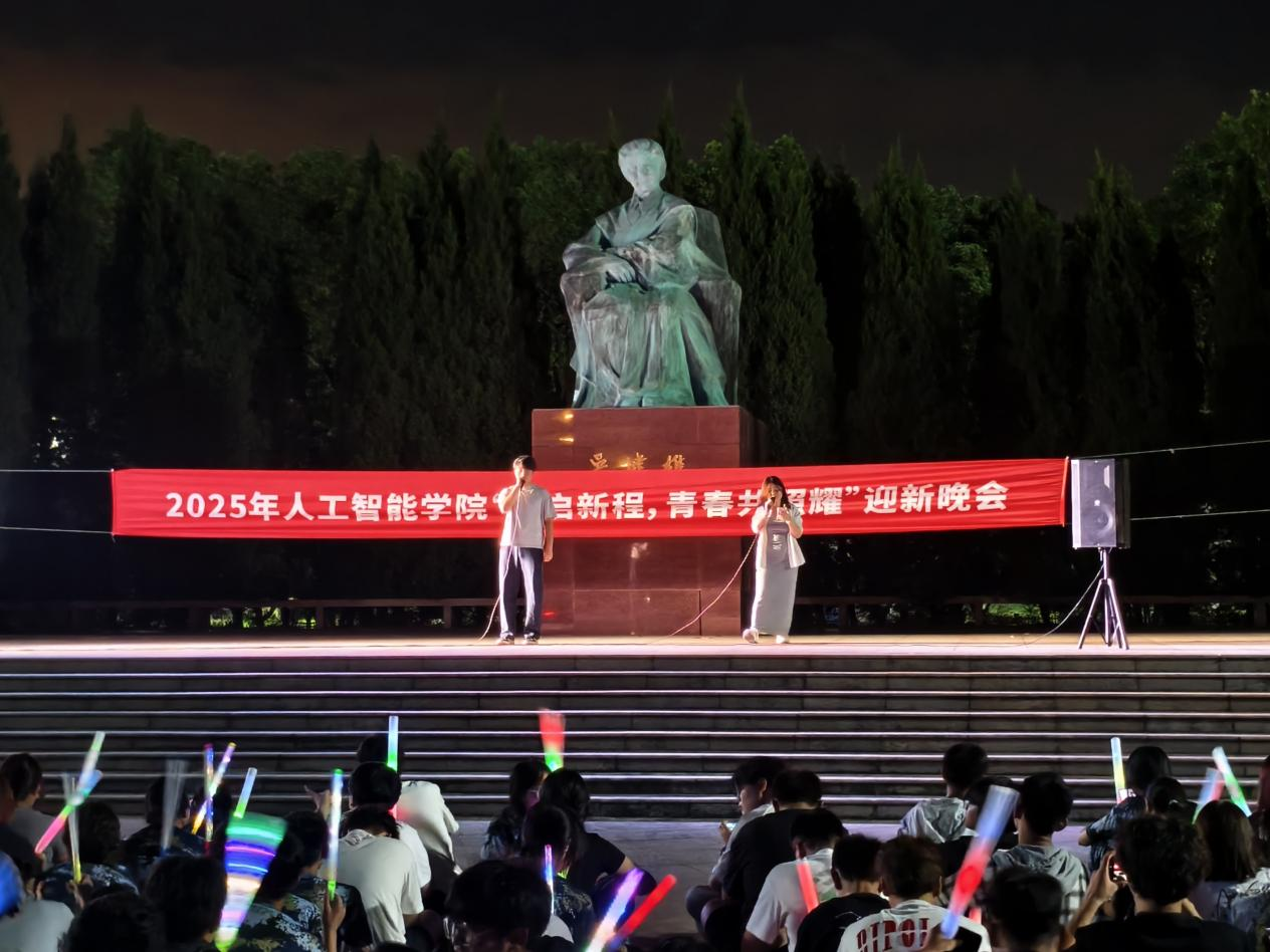 9月22日,人工智能学院在吴健雄广场隆重举行“AI启新程,青春共照耀”2025级新生迎新晚会。晚会由徐艺画、张卓凯、杜馨惠三位同学主持,五百余名新生参与其中。