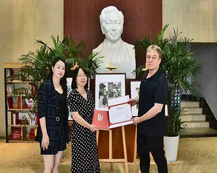 捐赠仪式上,艺术家将作品郑重地交给吴健雄陈列馆负责人,双方亲切握手并合影留念。这一刻,不仅标志着作品正式入驻陈列馆,更象征着跨国界、跨领域的科学与艺术的交流与合作开启新的篇章。