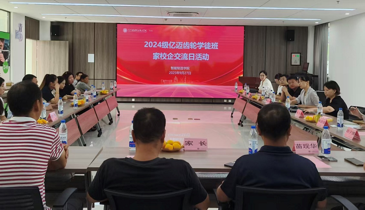 9月27日,智能制造学院联合经济管理学院在D1-103开展2024级亿迈齿轮学徒班家校企交流日活动。亿迈齿轮(太仓)有限公司学徒制中心经理马介宏、人力资源业务伙伴魏永军、培训师王逸雯、邓艳,智能制造学院党总支书记周玲余、院长荆瑞红,经济管理学院副院长傅兰、班主任辅导员以及2024级全体学徒和家长参加本次活动。