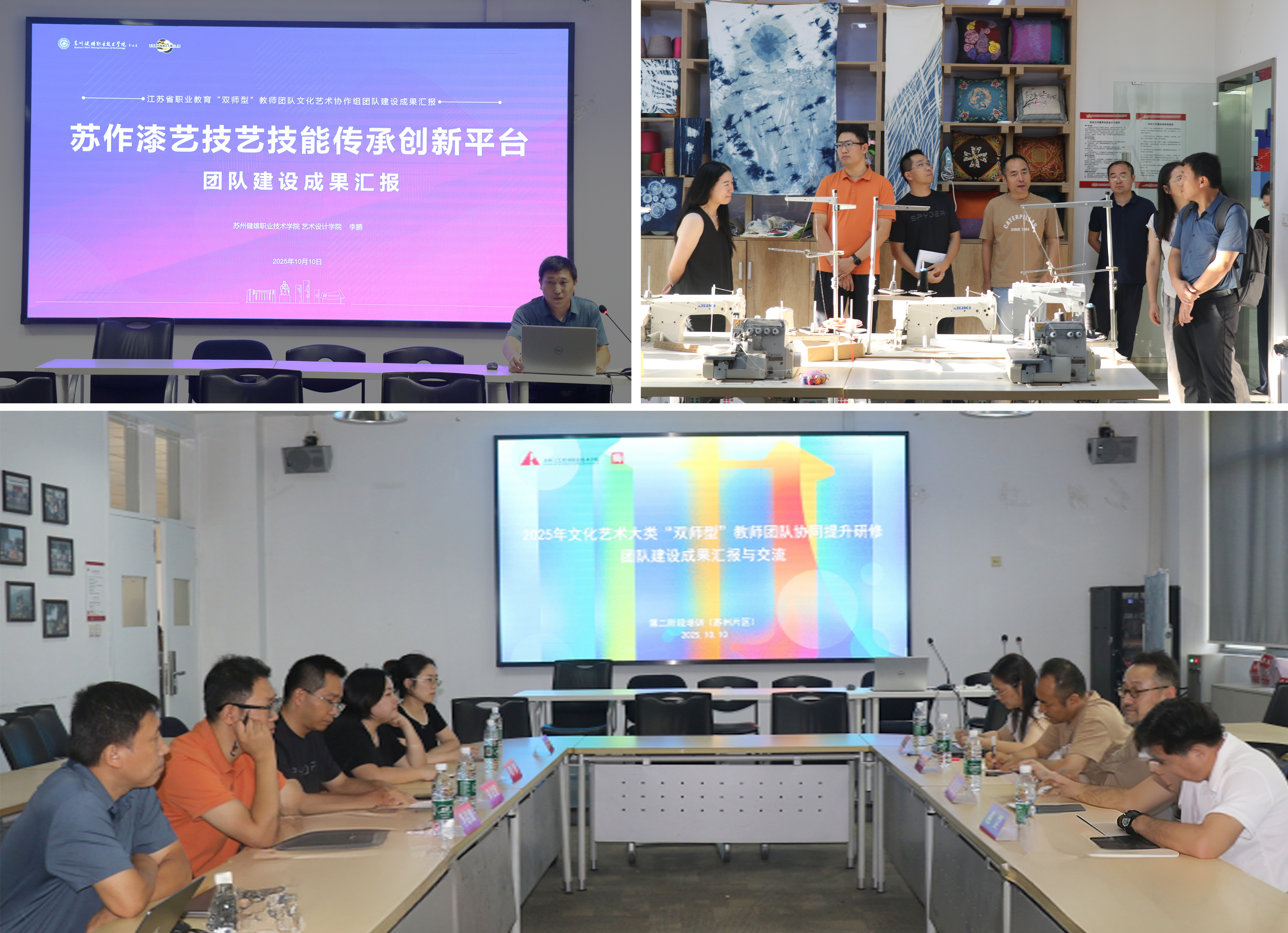 10月10日,江苏省职业教育“双师型”教师团队文化艺术协作组在苏州工艺美术职业技术学院召开苏州片区建设成果汇报会。来自苏州工艺美术职业技术学院、苏州健雄职业技术学院、苏州工业园区服务外包职业学院、苏州财经旅游职业技术学院4家单位的6个团队集中观摩分享团队建设成效和经验。我院“苏作漆艺技艺技能传承创新平台”参加会议并做了专题汇报,就三年建设成果和经验做了系统介绍。