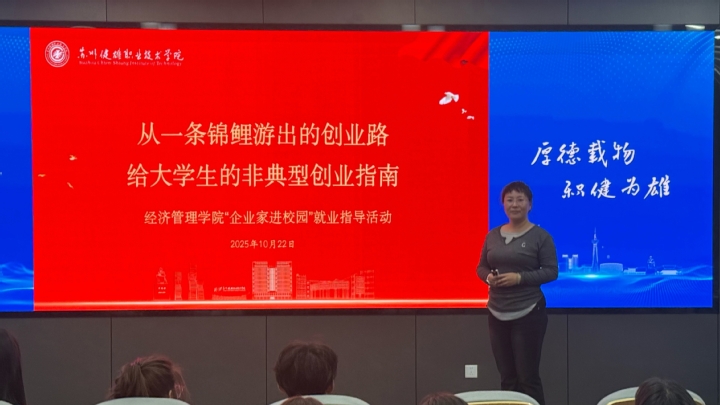 为提升学生就创业意识和就业竞争力,10月22日下午,经济管理学院在C3-101教室举办“企业家进校园”就创业指导讲座。本次活动特邀苏州市农村青年创新创业联合会副会长、江苏启泓生态农业发展有限公司总经理郭珺女士分享实战经验,经济管理学院团总支书记顾子琪老师主持,百余名师生聆听讲座。