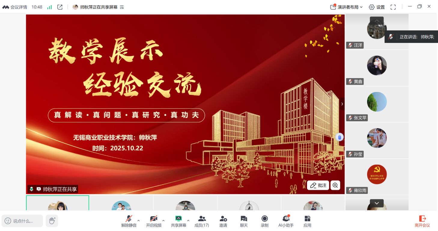 为提升马克思主义学院专职教师教学能力和参赛水平,我院特邀请无锡商业职业技术学院马克思主义学院习近平新时代中国特色社会主义思想概论教研室主任帅秋萍老师于10月22日做《示范课教学及教学经验分享》专题在线讲座。马克思主义学院院长韩学芹主持讲座,全体思政课教师参会。