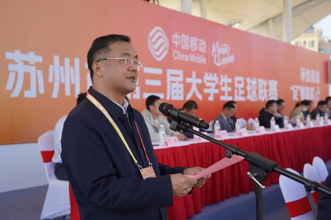 10月29日下午,“中国移动”苏州市第三届大学生足球联赛在我院拉开战幕。苏州市委常委、宣传部部长金洁,太仓市委副书记、市长徐华东,太仓市副市长周飞,苏州市体育局、教育局、团市委、公安局、苏州市足协、苏州市学生联合会主要领导,太仓市文体广旅、教育、卫健、公安、消防等相关部门负责人,我院党委领导班子和各高校的参赛队员、师生代表等参加开幕式并共同观看揭幕战比赛。来自苏州全市各高校的足球健儿们将再次集结,用汗水诠释拼搏精神,以足球搭建友谊桥梁,驰骋青春的绿茵盛宴,为热爱并肩作战!