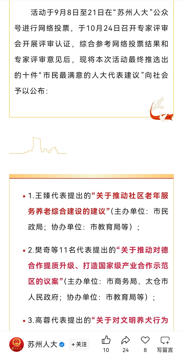 苏州人大官微 | 喜报!“情系苏州——市民最满意的人大代表建议(2025)”名单新鲜出炉!