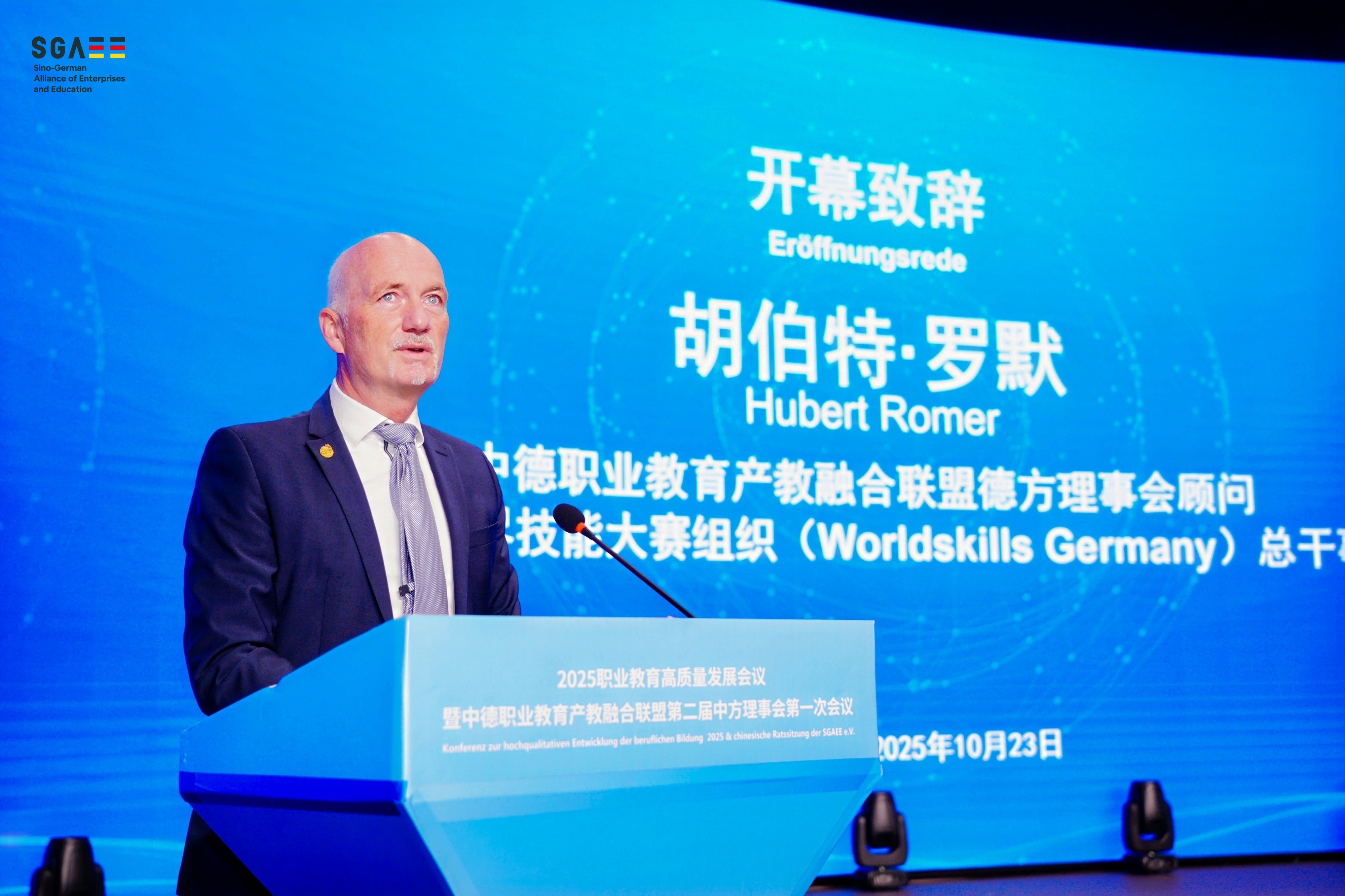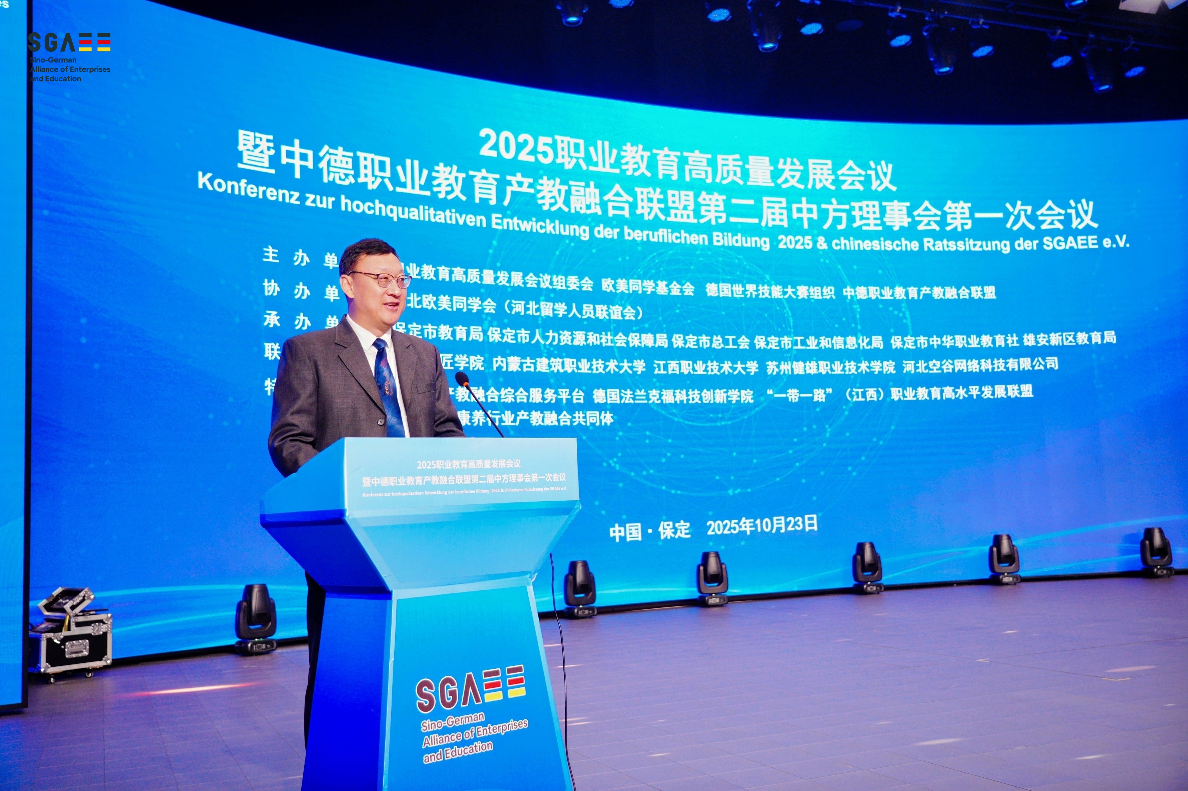 10月22日至10月24日,2025职业教育高质量发展会议暨中德职业教育产教融合联盟理事会会议在中国保定职教园区成功举办。本次会议由欧美同学基金会、德国世界技能大赛组织和中德产教融合联盟共同主办,我院作为联合单位承办了此次会议。学院党委书记苏霄飞应邀出席此次会议,并作为中德产教融合联盟常务副理事长主持了大会一阶段会议。同时作为特邀嘉宾作“推进市域产教联合体建设,塑造产教融合新形态”的主旨报告,指出面对当前新形势下的经济社会发展,职业教育必须主动对接区域产业发展需求,详细介绍了太仓中德产教融合的生动实践,为中德职教和区域产教融合高质量发展提供了样本案例,引发与会专家学者的广泛关注和赞誉。