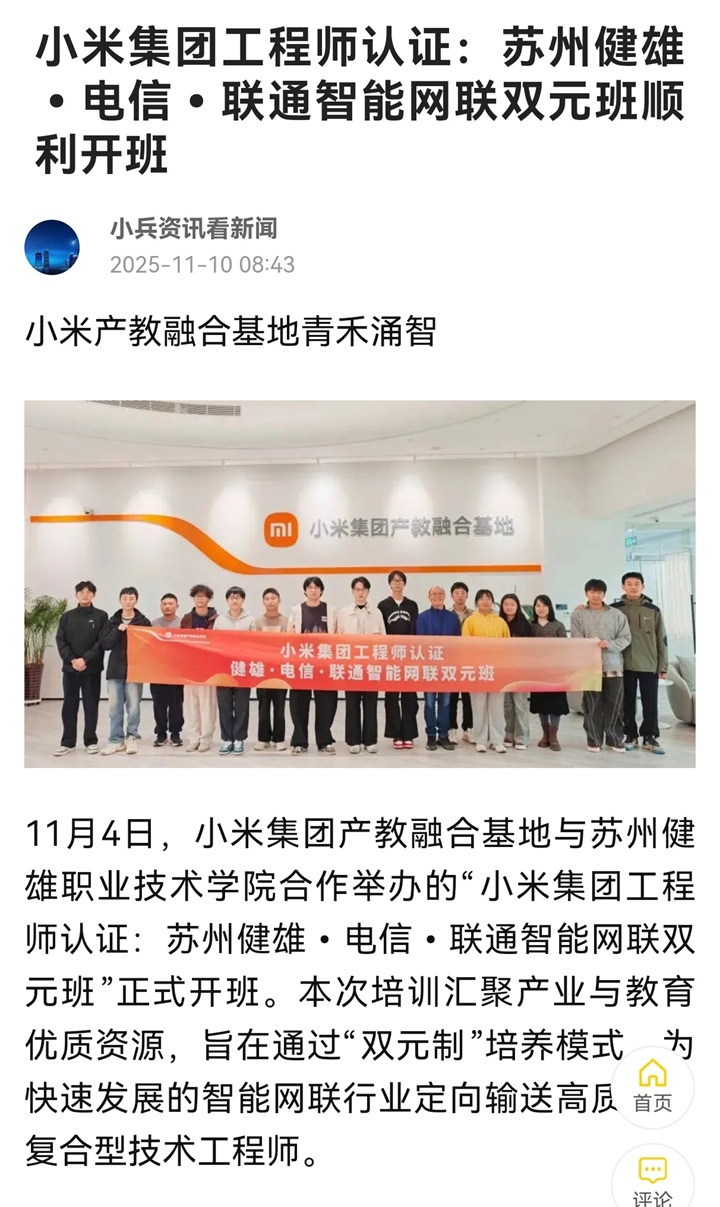 搜狐网 | 小米集团工程师认证:苏州健雄•电信•联通智能网联双元班顺利开班