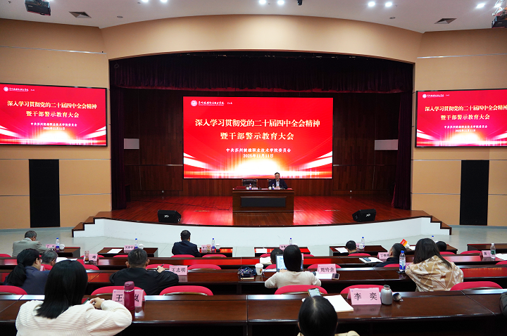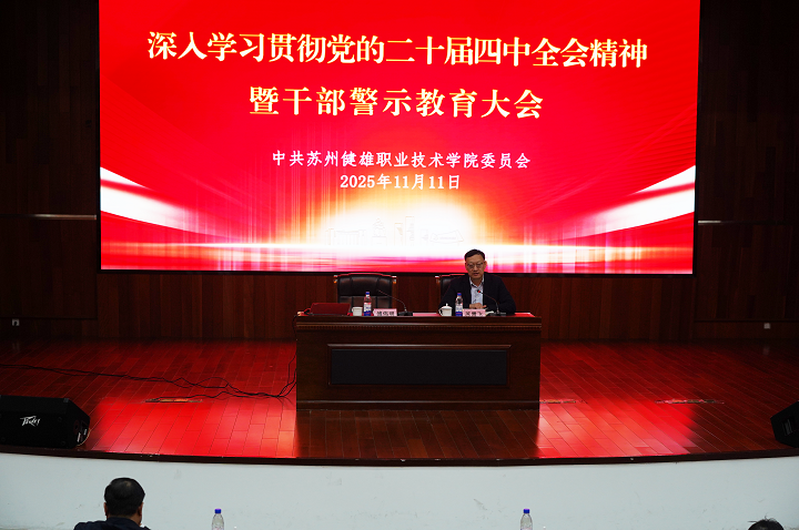 11月11日下午,我院召开深入学习党的二十届四中全会精神暨干部警示教育大会,传达学习习近平总书记在党的二十届四中全会上的重要讲话和全会精神,对进一步以案为鉴,纵深推进全面从严治党作出部署安排。中共苏州市委党校傅伟明教授应邀作题为《十五五”规划建议发展原则目标及总体部署》的专题辅导报告。党委书记苏霄飞主持会议并讲话。全体党委委员、中层干部、纪检干部,基层党组织负责人、党员教师代表等100余人参加会议。