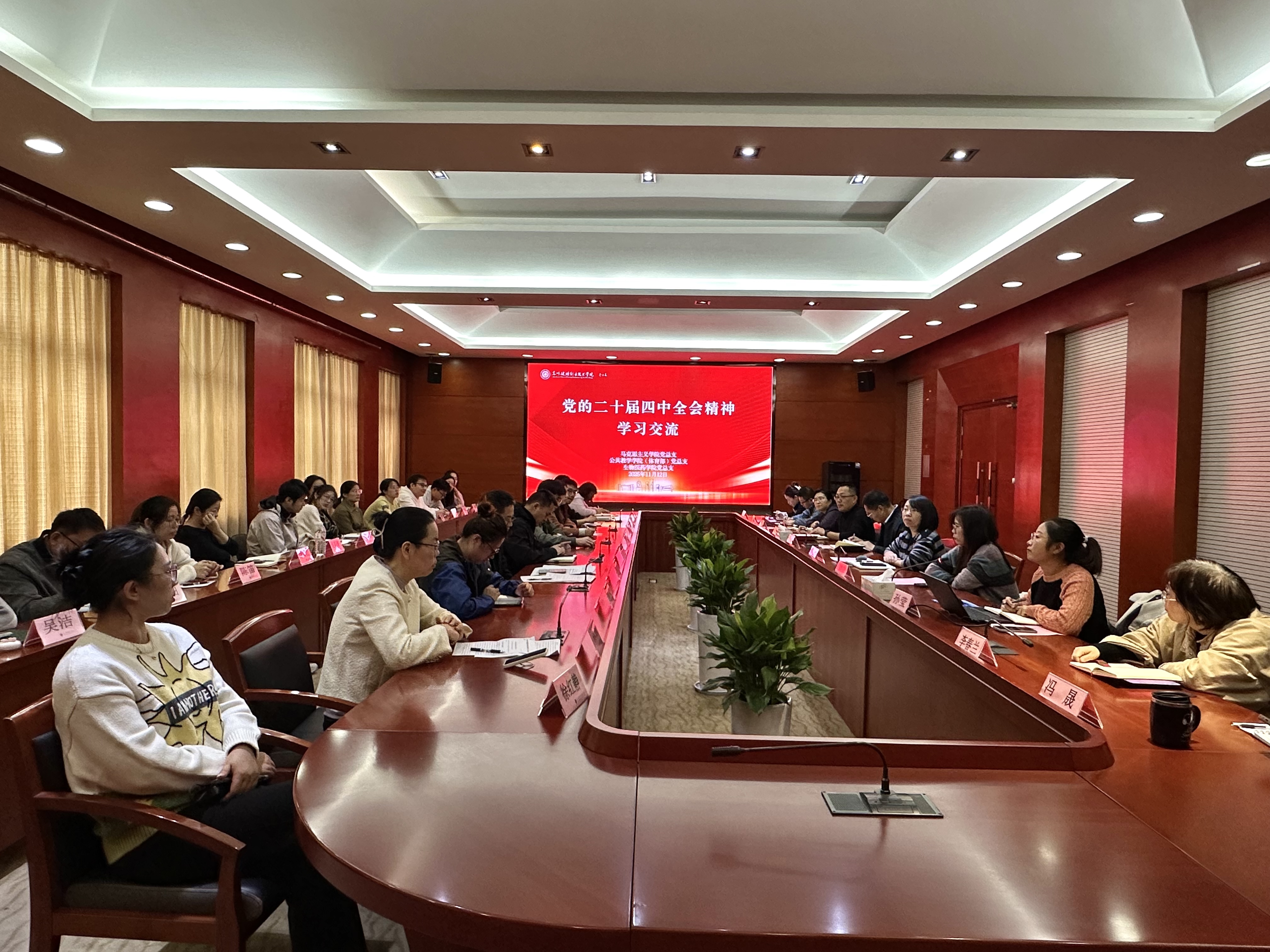 为深入学习贯彻党的二十届四中全会精神,切实扛起“十五五”发展使命,11月12日下午,马克思主义学院、公共教学学院(体育部)党总支与生物医药学院党总支联合召开理论学习中心组(扩大)学习会。学院党委委员、党委宣传部部长丁锴,马克思主义学院、公共教学学院(体育部)和生物医药学院全体总支委员、支部委员及党员代表参加学习会。