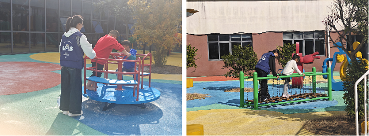 游乐区的互动,是这场“青春之约”的预热。高高的滑梯前,“智小匠”提前检查设施安全,然后蹲在滑梯入口处,用温柔的话语鼓励因胆怯而犹豫的孩子:“别怕,我在下面接着你!”当孩子鼓足勇气滑下时,等候在滑梯底部的“智小匠”立刻张开双臂稳稳接住,用拥抱化解孩子的不安;秋千架旁,“智小匠”根据孩子的身体状况调整推送力度,轻轻推动秋千的同时,还会和孩子一起哼唱儿歌,看着孩子的笑脸随着秋千一同“飞向”天空。这一推一接、一唱一和之间,既有对特殊儿童的悉心照料,更藏着青春担当与童年依赖的美好契合,构成了校园里最动人的风景线。