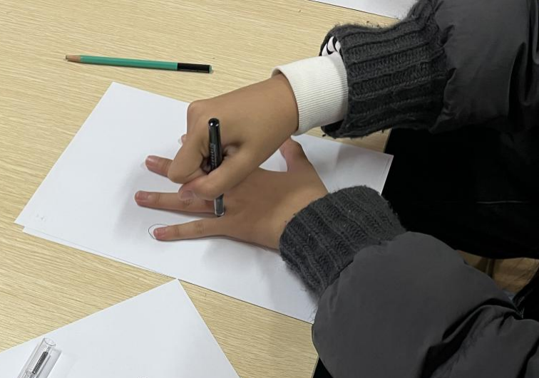 活动在轻松愉快的破冰游戏中拉开帷幕。同学们通过“手的奇妙联想”,在手掌轮廓中描绘近期的情绪、目标与力量来源,迅速融入创作氛围。在“绘制我的‘未来能量图’”环节中,同学们在轻柔的音乐与引导语的陪伴下,闭目冥想,绘制出属于自己的“房树人”整合画面。房子代表内心的安全感,树木象征成长与潜力,而树下的人物则是理想中未来的自己。同学们用画笔勾勒出内心的图景,不少作品充满想象与情感,展现出新生对大学生活的期待与对未来的憧憬。