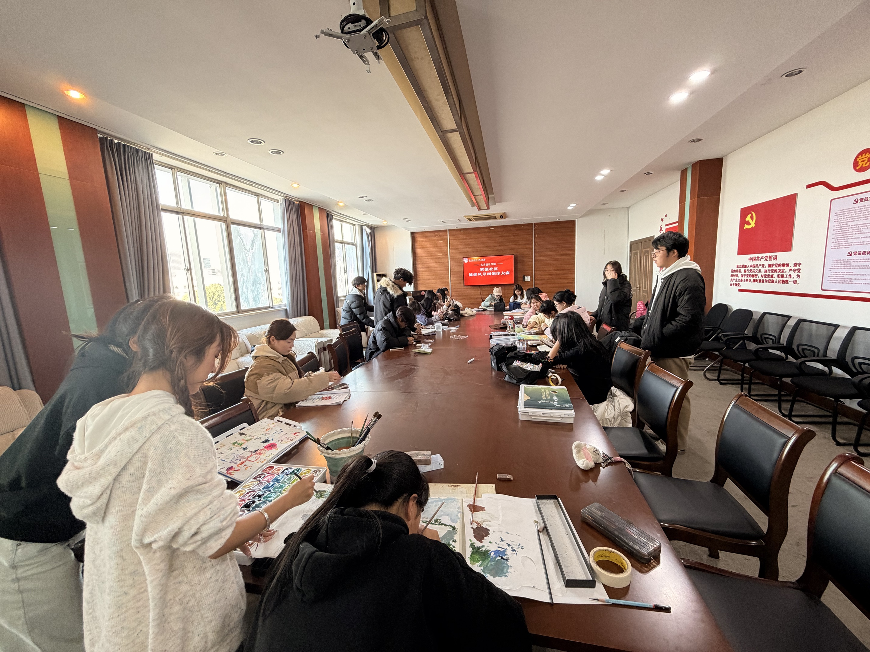 参与者们携带画具走遍校园角落,将教学楼的静谧、林荫道的清幽、湖畔的灵动等场景纳入画中,以油画、水彩、素描、数字绘画等多种艺术形式,展现对校园的独特感知与深厚情感。作品随后在学院展厅集中展出,细腻的笔触、鲜活的色彩引发师生广泛关注与好评,为校园增添了浓厚的艺术氛围。