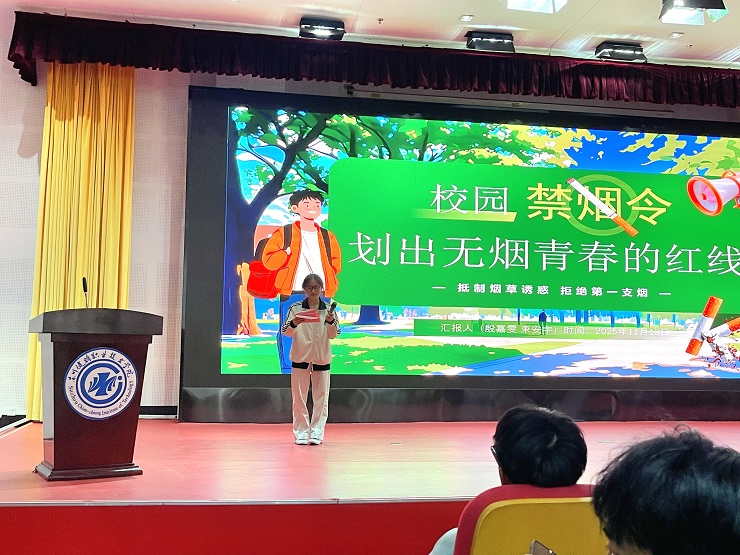 活动现场,两组学生分别从理论和实际案例入手,围绕“青少年与无烟生活”进行专题分享,告诉同学们烟草的危害,并基于此提出三大倡议:一是自我约束,树立健康观念,拒绝第一支烟;二是相互监督,友善提醒违规吸烟行为,争做禁烟大使;三是养成良好生活习惯,通过运动、阅读等健康爱好转移注意力,助力健康中国建设。