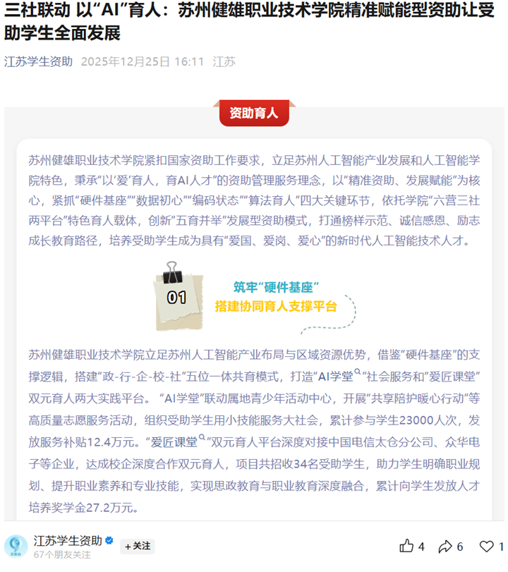 江苏学生资助官微 | 三社联动 以“AI”育人:苏州健雄职业技术学院精准赋能型资助让受助学生全面发展