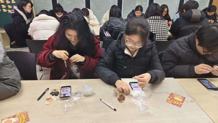 现场开展DIY马年钥匙扣手工制作。志愿者分发环保材料包并逐步演示,马形挂饰寓意“奔腾向前、马到成功”,寄托着对新春的美好期盼。活动最后,同学们互写贺卡,传递真挚祝福。