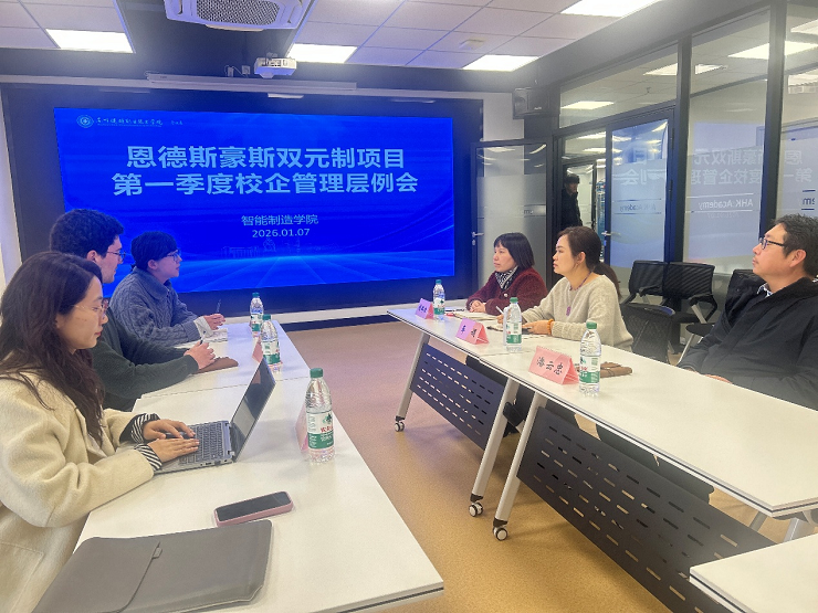 1月7日,我院召开恩德斯豪斯双元制学徒项目第一季度校企管理层例会。恩德斯豪斯(苏州)自动化仪表有限公司人力资源经理张慧慧、培训中心讲师赵佳、德国培训师Marco,智能制造学院院长荆瑞红、机电一体化技术专业带头人车娟及项目专任教师潘云忠出席会议。