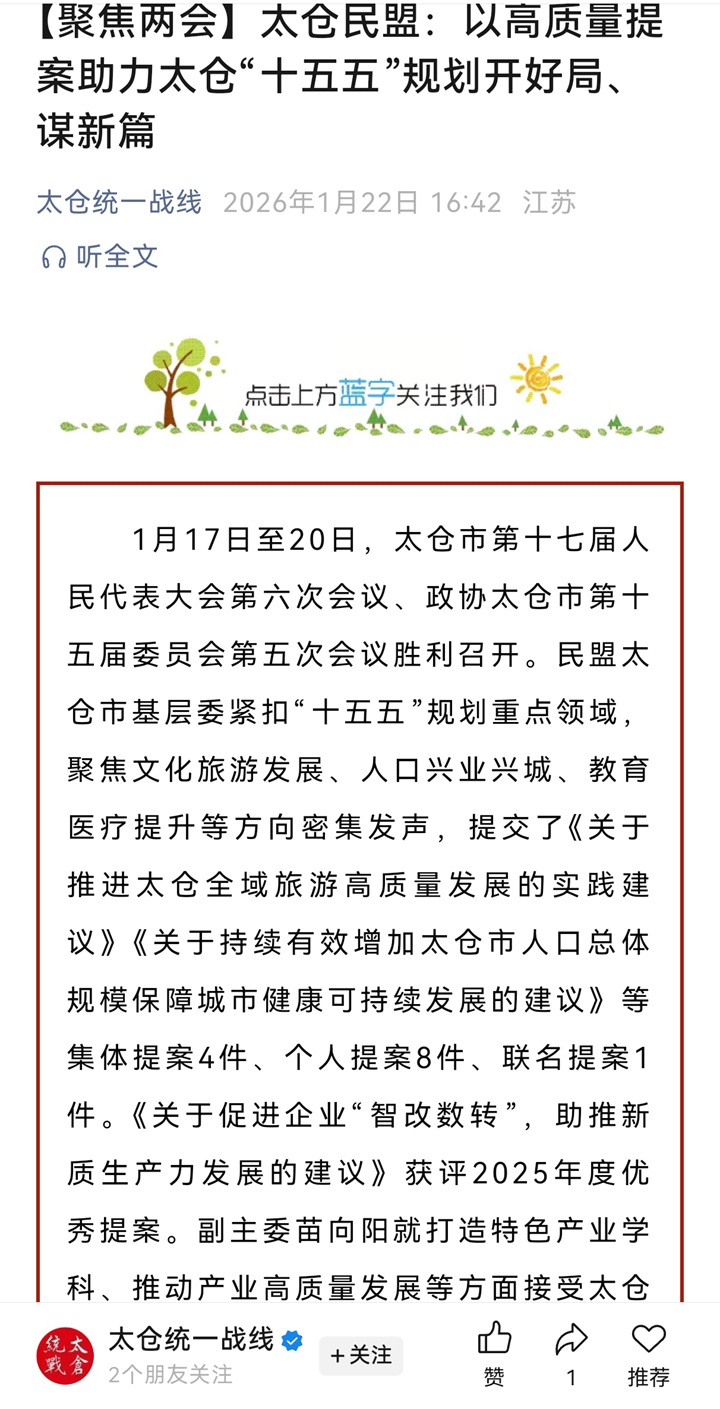 太仓统一战线官微 | 【聚焦两会】太仓民盟:以高质量提案助力太仓“十五五”规划开好局、谋新篇