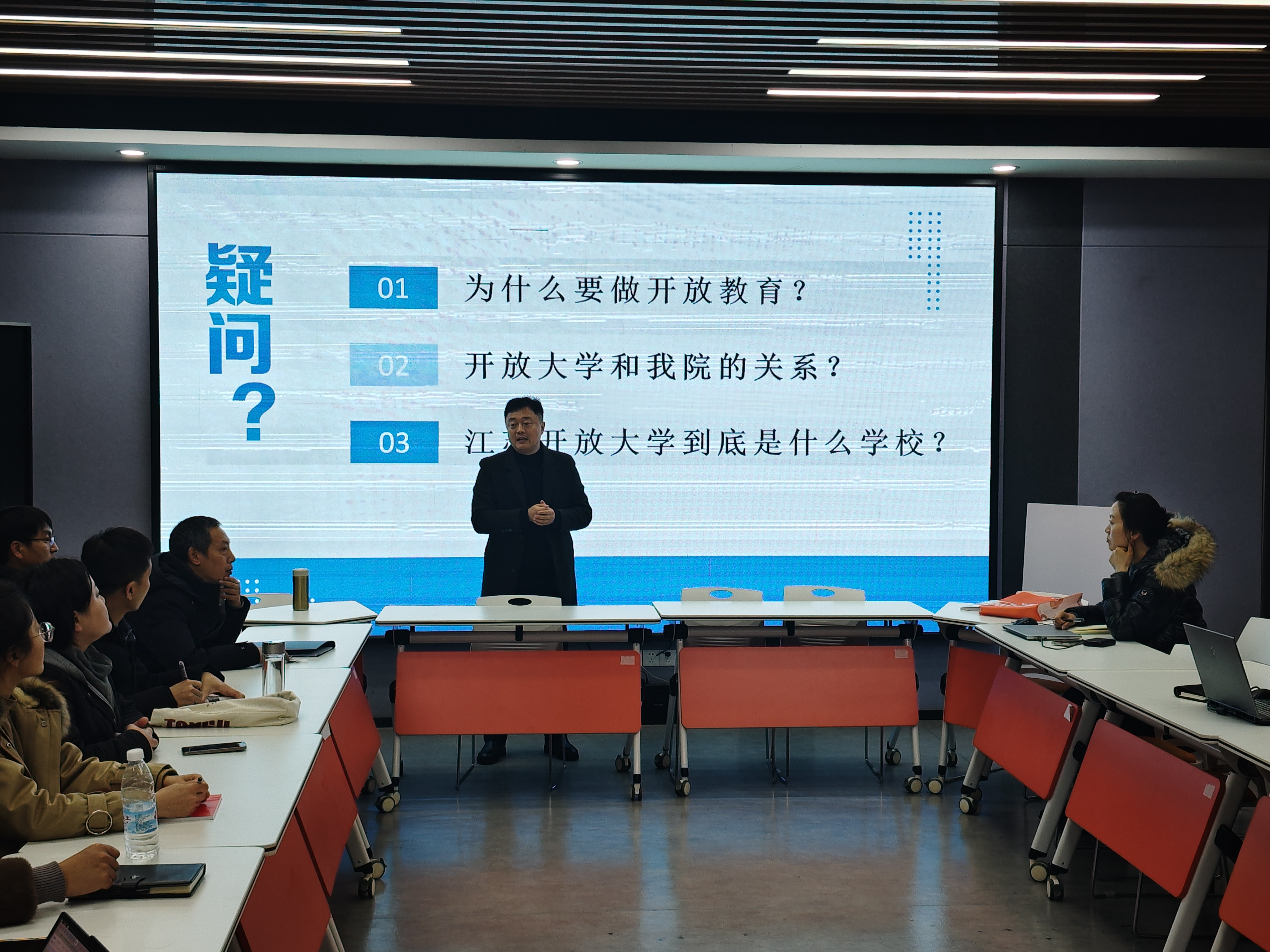 会上,贾红圣副院长结合当前继续教育发展新形势,对开放教育学历提升服务项目进行了全面、细致的解读。他从项目招生政策的核心要点、专业设置的特色优势、课程体系的科学构建、多元化助学模式的具体内容以及学历提升对个人职业发展的长远前景等方面展开讲解,用详实的案例和清晰的解读,帮助全体与会教职工全面把握项目内涵、精准掌握工作要点,为后续开展宣传推广和服务工作奠定了坚实基础。