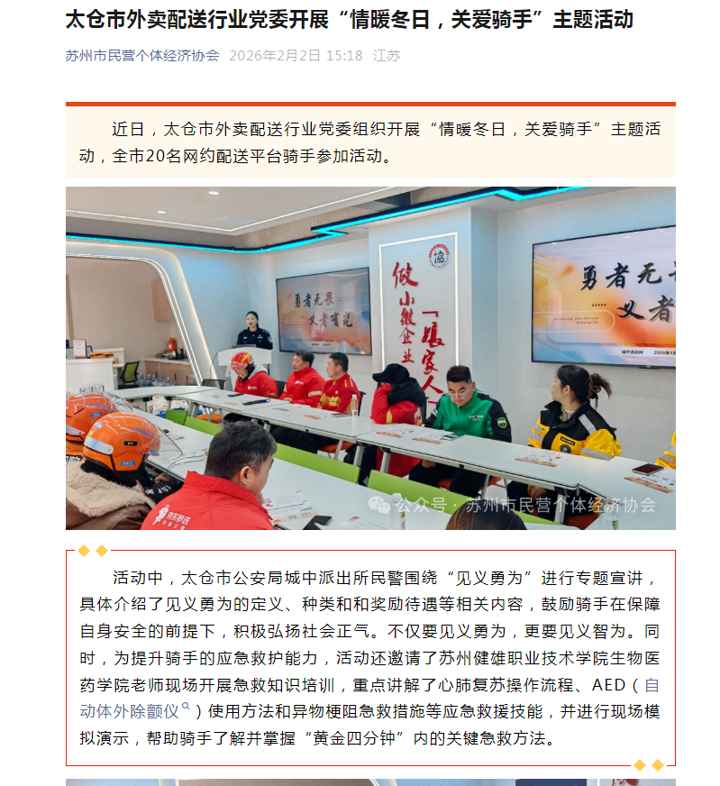 苏州市民营个体经济协会官微丨太仓市外卖配送行业党委开展“情暖冬日,关爱骑手”主题活动
