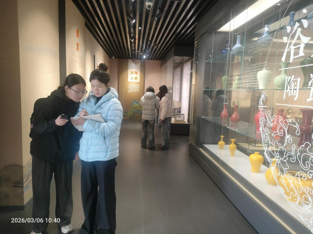 本次实践教学将课堂搬进学院陶瓷艺术馆,以传统造型艺术符号采集为主题,引导学生近距离观察、记录和分析传统陶瓷器物中的造型语言、纹饰图案与空间意象。在志愿讲解员的引导下,学生们系统学习了陶瓷艺术的历史演变与文化内涵,并结合《公共空间设计》课程要求,探讨传统符号在现代公共空间中的转译与应用路径。