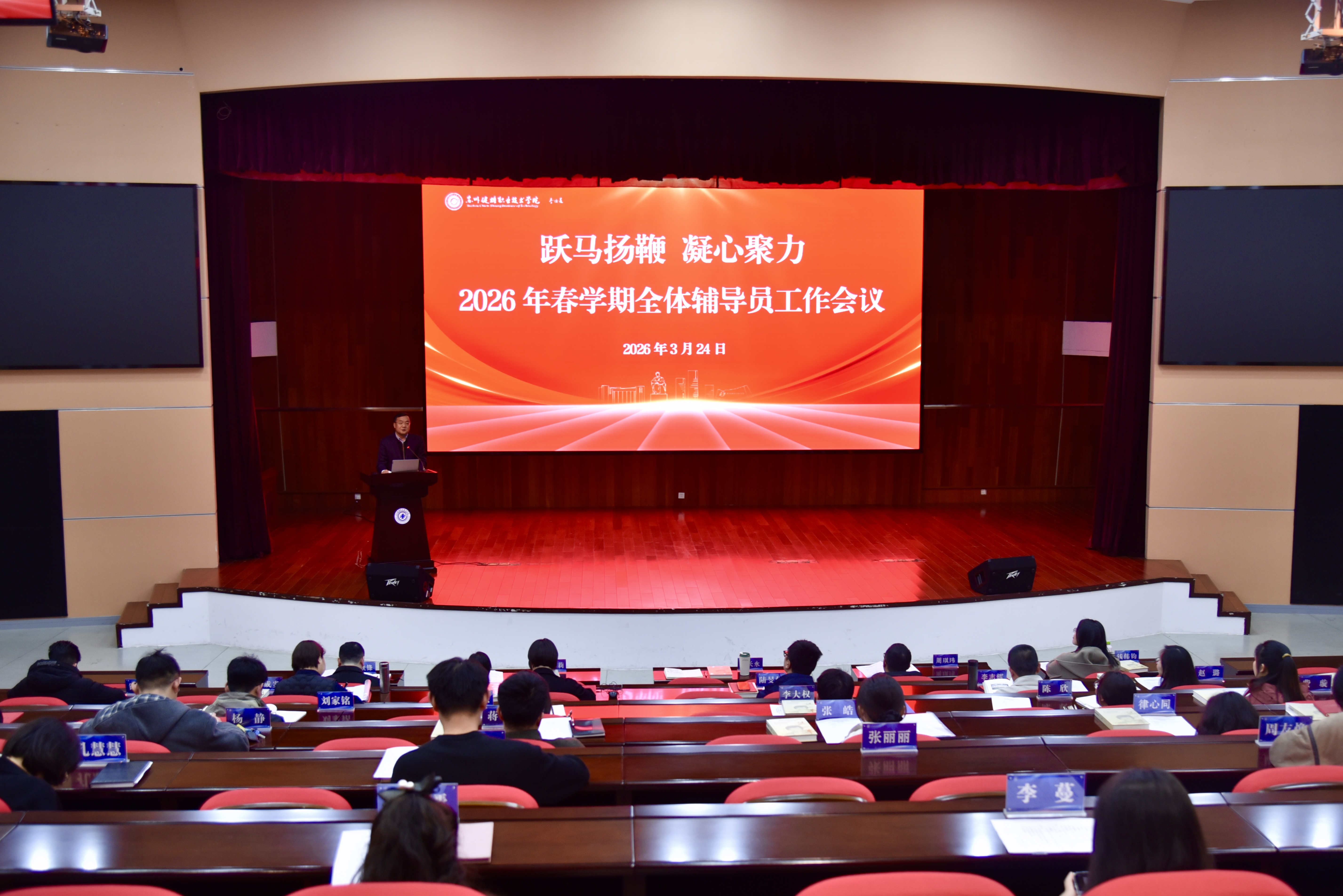 为全面总结2025年度学生工作与共青团工作成效,表彰先进、部署新学期重点任务,3月24日下午,我院召开2026年春学期全体辅导员会议。学院党委书记林长永出席会议并讲话,党委委员、副院长谢小莉主持会议。人事处、学生处和团委部门负责人、各二级学院党总支副书记、全体辅导员、学生处和团委全体工作人员参会。