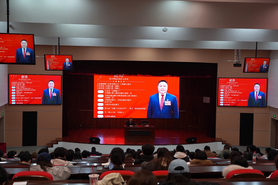 报告会上,褚锋围绕“大会概况”“习近平总书记在大会期间的重要讲话精神”“全国人大常委会、‘一府两院’工作报告、‘十五五’规划纲要的主要内容”“关于编纂生态环境法典,制定民族团结进步促进法、国家发展规划法情况”“江苏代表团主要活动和审议情况”“践初心、履使命”等多个方面,系统讲述了今年全国两会盛况,重点传达了习近平总书记在大会期间的重要讲话精神,以及习近平总书记参加江苏代表团审议时的重要讲话精神。他结合参会期间自身所见所闻和所思所感,分享了两会期间代表们审议的内容“实”,提出的建议“实”和会议保障“实”,作了一场精彩、生动、深刻的专题辅导,为师生全面准确理解和把握今年全国两会精神,特别是深刻领会国家关于教育、科技、人才以及发展新质生产力等方面的新部署新要求,具有重要的指导意义。师生们全程认真聆听,现场多次响起掌声。
