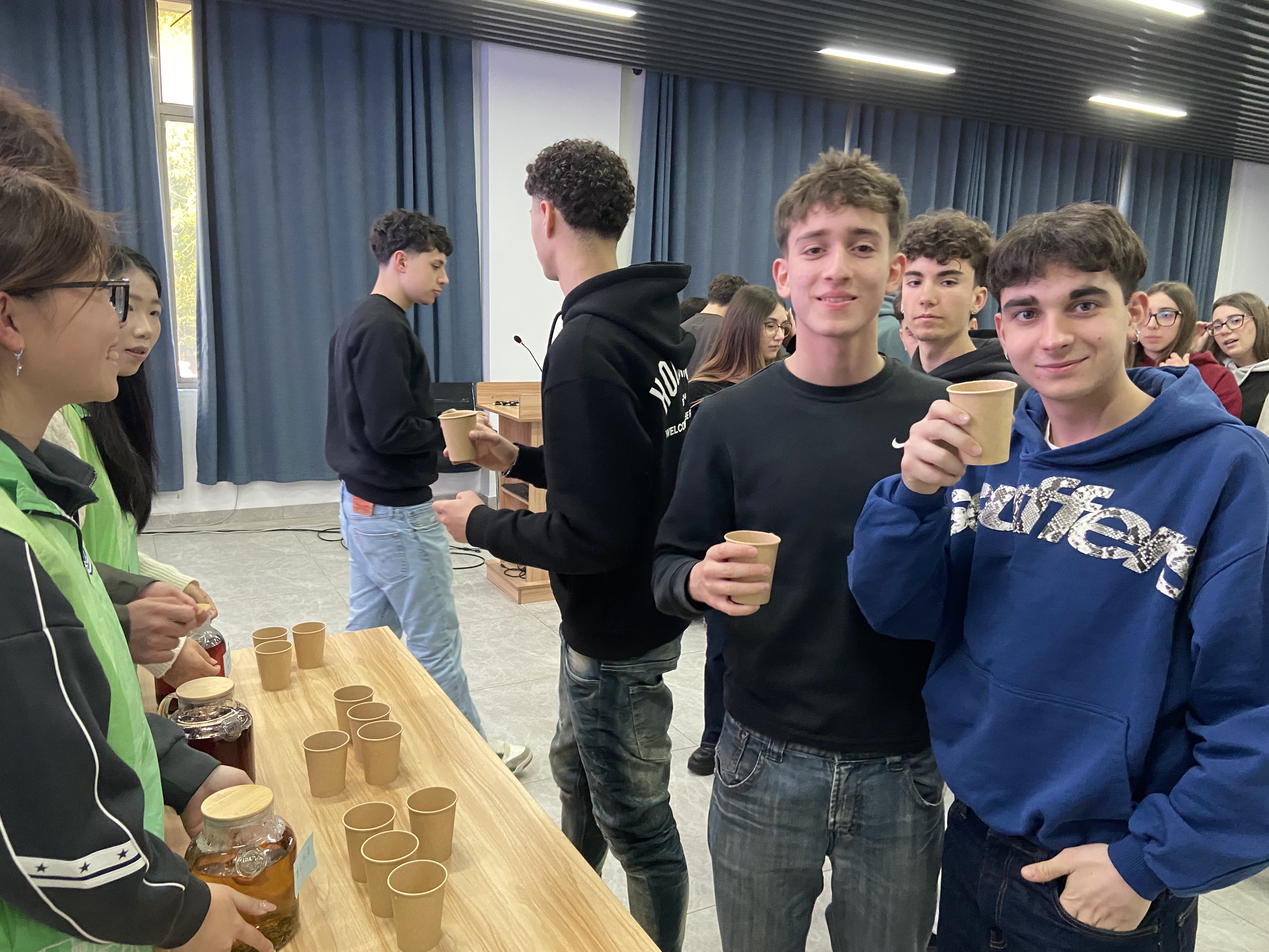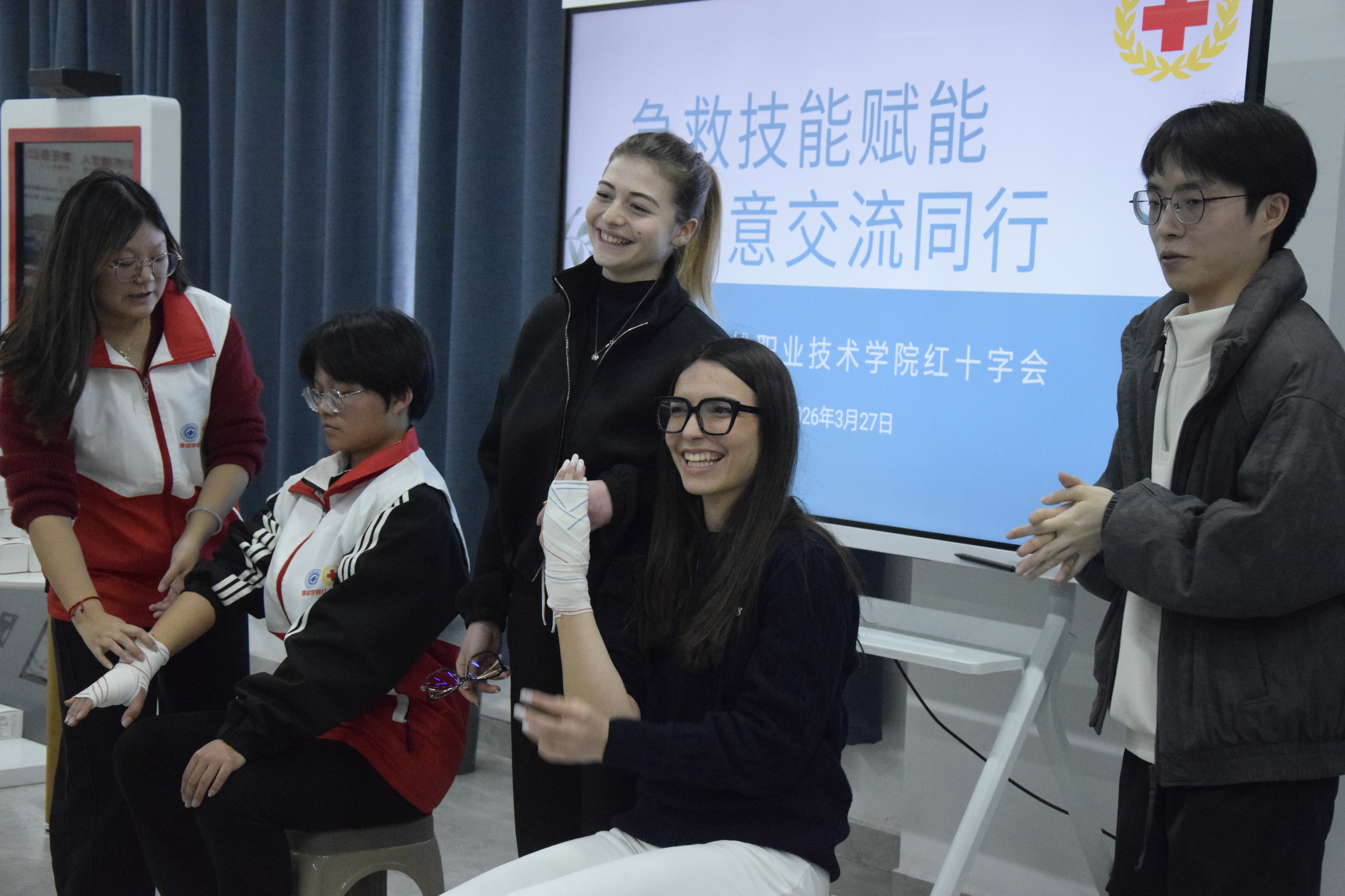 活动中,侯波博士为意大利学生讲解生命科学前沿知识,介绍生物医药领域最新研究成果;校红十字会志愿者指导应急救护技能,让学生掌握心肺复苏、包扎等实用操作。沉浸式体验环节独具特色,意大利学子品鉴中药茶饮,跟随志愿者习练八段锦,领略中华传统康养文化魅力。