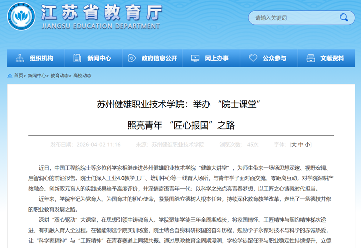 江苏省教育厅 | 苏州健雄职业技术学院:举办 “院士课堂” 照亮青年 “匠心报国”之路