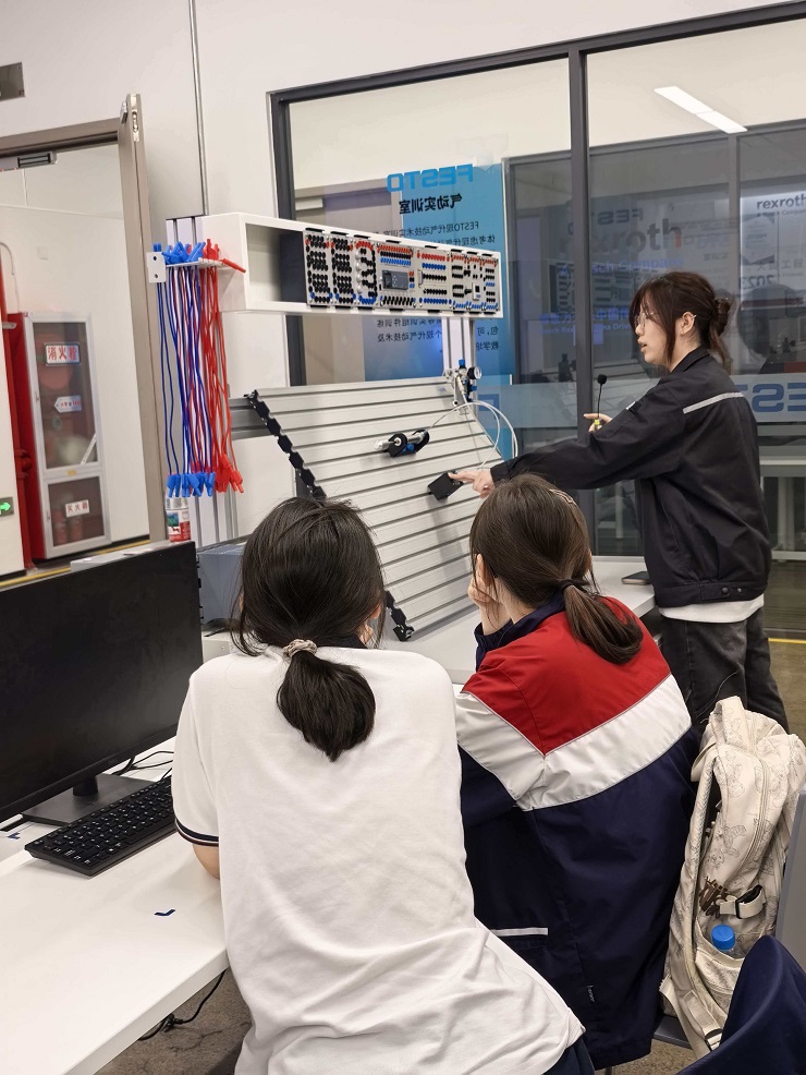 活动首站为双元制产业园。在三号楼展馆中,学生们聆听太仓中德合作历程讲解,了解双元制教育模式。志愿者分组跟班,维持秩序、解答疑问,并留意学生对产业合作、职业教育的兴趣点,做好记录。随后在八号楼实训中心,志愿者为学生讲解先进的智化实训装备,并协助老师指导学生动手实践。