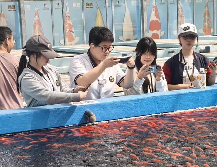 最后一站为锦鲤园。学生们在轻松氛围中观赏锦鲤,了解生态养殖知识。志愿者在返程前认真清点各班人数,确保无一人遗漏。