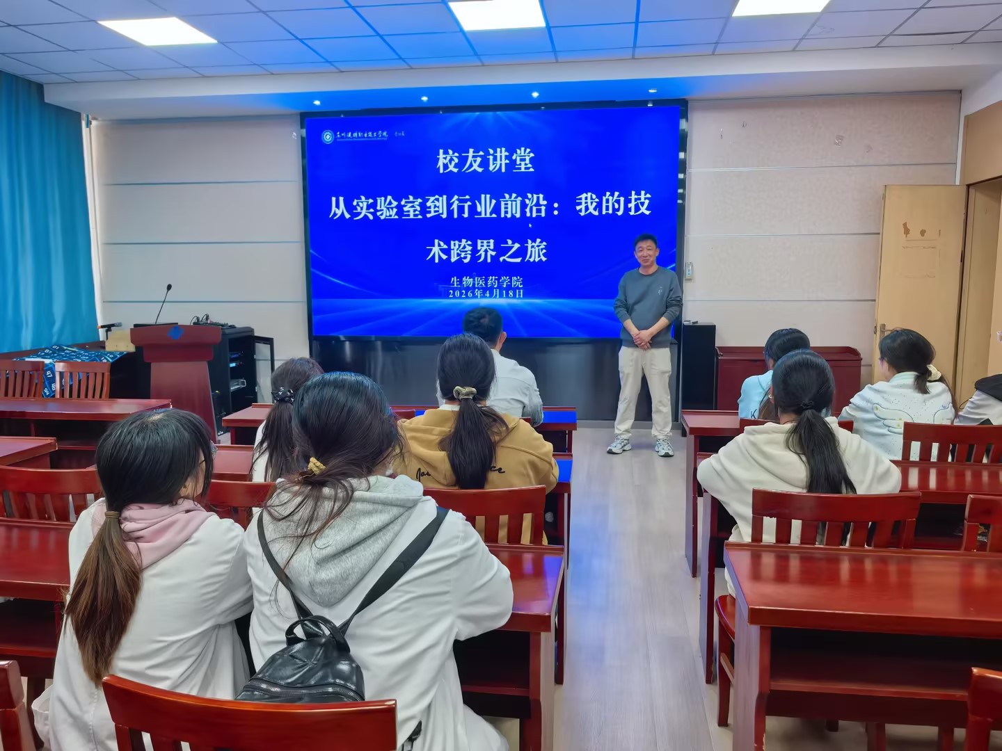 何伟结合自身从基层成长为企业管理骨干的职业历程,向学弟学妹分享求职经验、职场心得与成长路径,勉励大家夯实专业、锤炼本领、坚守匠心。宣讲会后,他为药学、分析检验等专业学子带来多个优质就业岗位,以实际行动反哺母校。