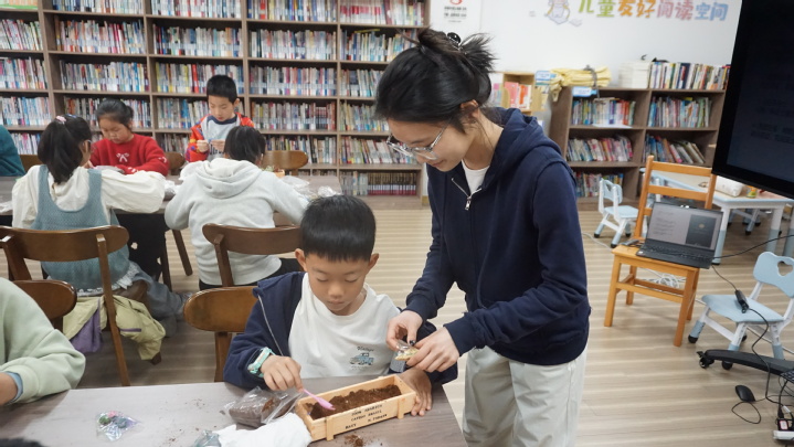 活动中,志愿者担任“节气讲师”,用通俗易懂的语言向孩子们讲解谷雨“雨生百谷”的自然规律和“惜时勤耕”的文化内涵。结合植物生长周期图解,志愿者现场示范播种、填土、浇水的正确方法,并耐心传授日常养护技巧。孩子们兴致勃勃地动手实践,小心翼翼地将幼苗植入花盆,专注投入的神情中流露出对新生命的好奇与期待,现场气氛温馨而活跃。