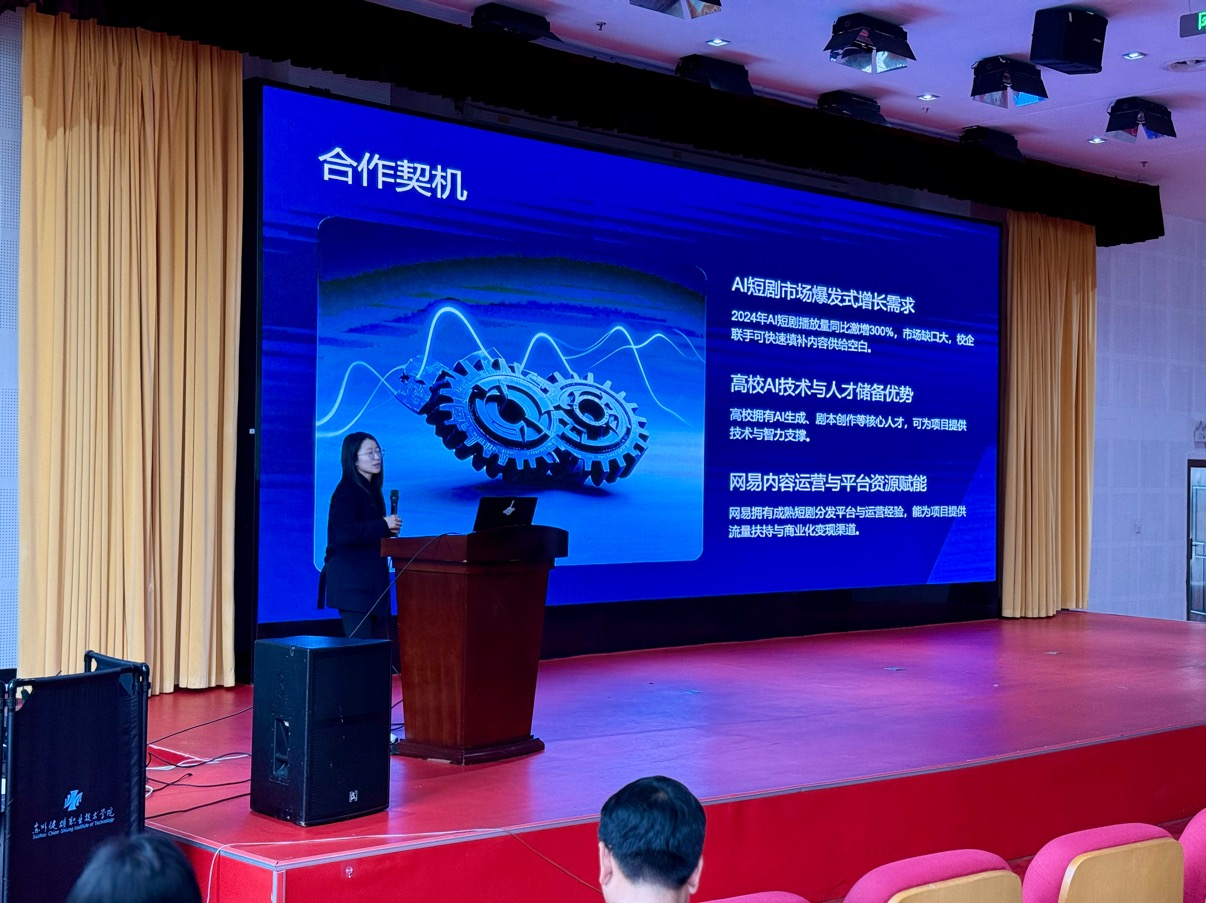 为把握数字内容产业发展趋势,深化产教融合协同育人,4月22日,艺术设计学院面向24 级、25级数字媒体技术、广告艺术设计专业学生,召开网易企业学院AI短剧项目动员会,开展行业宣讲与项目对接。
