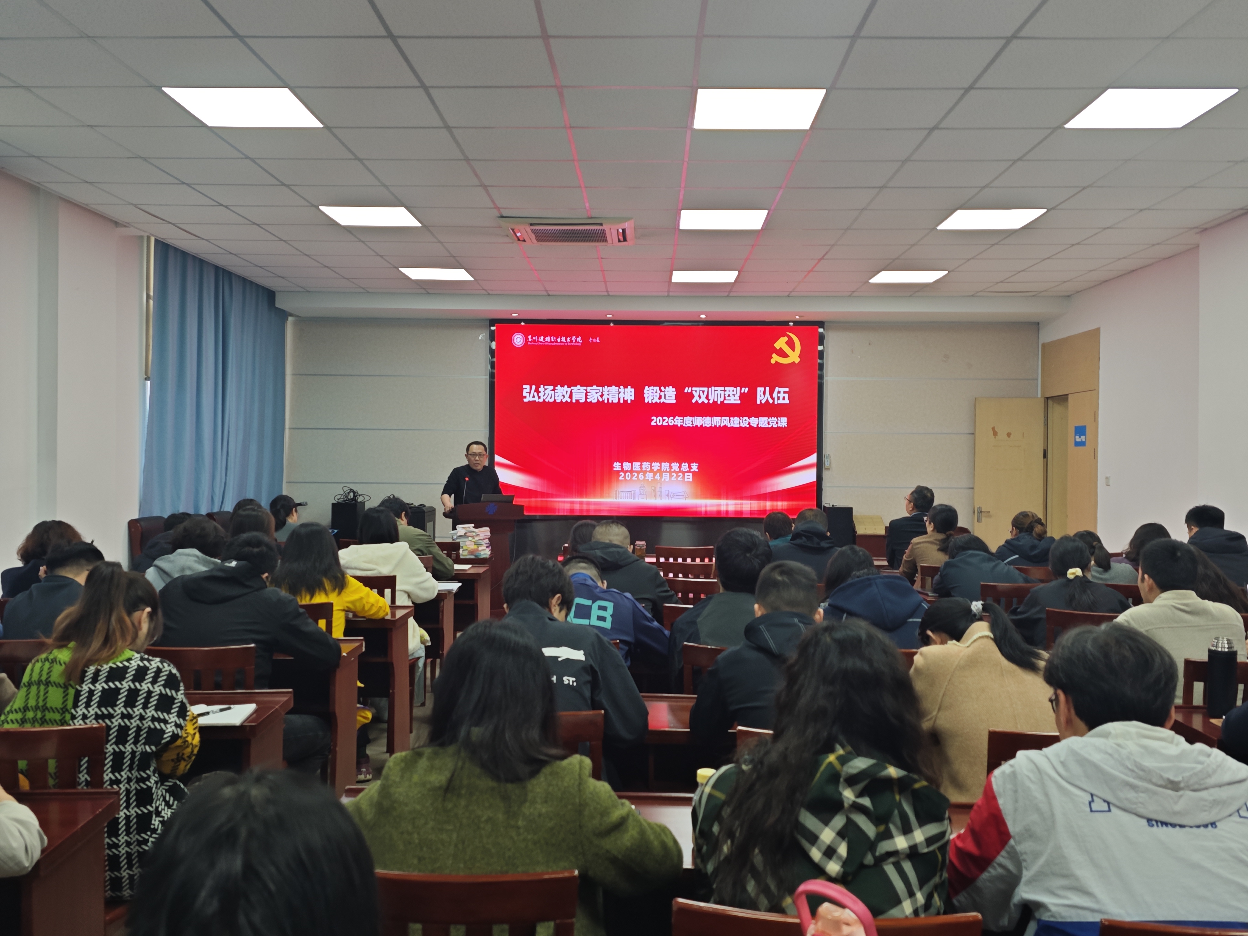 为全面加强师德师风建设,不断提升教师思想政治素养和教育教学水平,4月22日,生物医药学院党总支在D3-514会议室组织《弘扬教育家精神 锻造“双师型”队伍》专题党课。全体教职工参加学习。