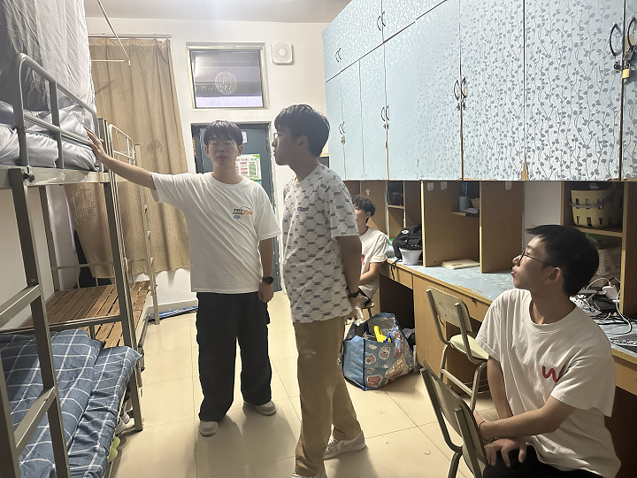 走访过程中,班助深入每间新生宿舍,仔细检查宿舍卫生状况、物品摆放,并重点排查是否存在违规电器、私拉乱接电线等安全隐患。对于检查中发现的问题,班助当场予以指正,并耐心讲解宿舍安全管理的相关规定,强调维护集体生活环境的重要性。除了严格的检查,走访更充满轻松愉快的交流氛围。作为刚刚经历过大学生活的“过来人”,班助与新生围坐在一起,亲切地分享他们在学习、社团活动以及时间管理方面的经验和心得。他们就新生提出的关于专业课程、校园生活等方面的困惑,给予细致的解答和建议。