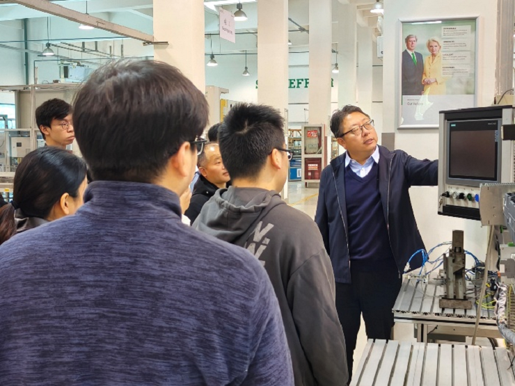 培训中心经理朱京龙分享了学徒在企业一年内个人能力分布雷达图,通过图文并茂的方式让家长知晓学生的成长和现阶段有待提升的模块,有助于学生补足短板,综合发展;同时还重点提及集团对学徒培养的重视,企业导师一对一指导,以及毕业后的优先录用机会,让家长对孩子的职业前景更有信心。 会议下半场,家长来到舍弗勒培训中心参观学习,朱经理演示了学生日常操作设备,讲解实训课程如何还原企业真实生产场景;随后为锻炼学生表达能力,让学生向家长讲解机床操作方法,这样不仅可以帮助学生巩固专业知识,还可以让家长直观感受舍弗勒双元制学徒在专业领域内的蜕变。