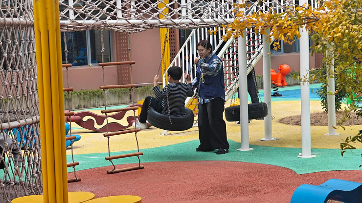 游乐区的互动,是这场“青春之约”的预热。高高的滑梯前,“智小匠”提前检查设施安全,然后蹲在滑梯入口处,用温柔的话语鼓励因胆怯而犹豫的孩子:“别怕,我在下面接着你!”当孩子鼓足勇气滑下时,等候在滑梯底部的“智小匠”立刻张开双臂稳稳接住,用拥抱化解孩子的不安;秋千架旁,“智小匠”根据孩子的身体状况调整推送力度,轻轻推动秋千的同时,还会和孩子一起哼唱儿歌,看着孩子的笑脸随着秋千一同“飞向”天空。这一推一接、一唱一和之间,既有对特殊儿童的悉心照料,更藏着青春担当与童年依赖的美好契合,构成了校园里最动人的风景线。