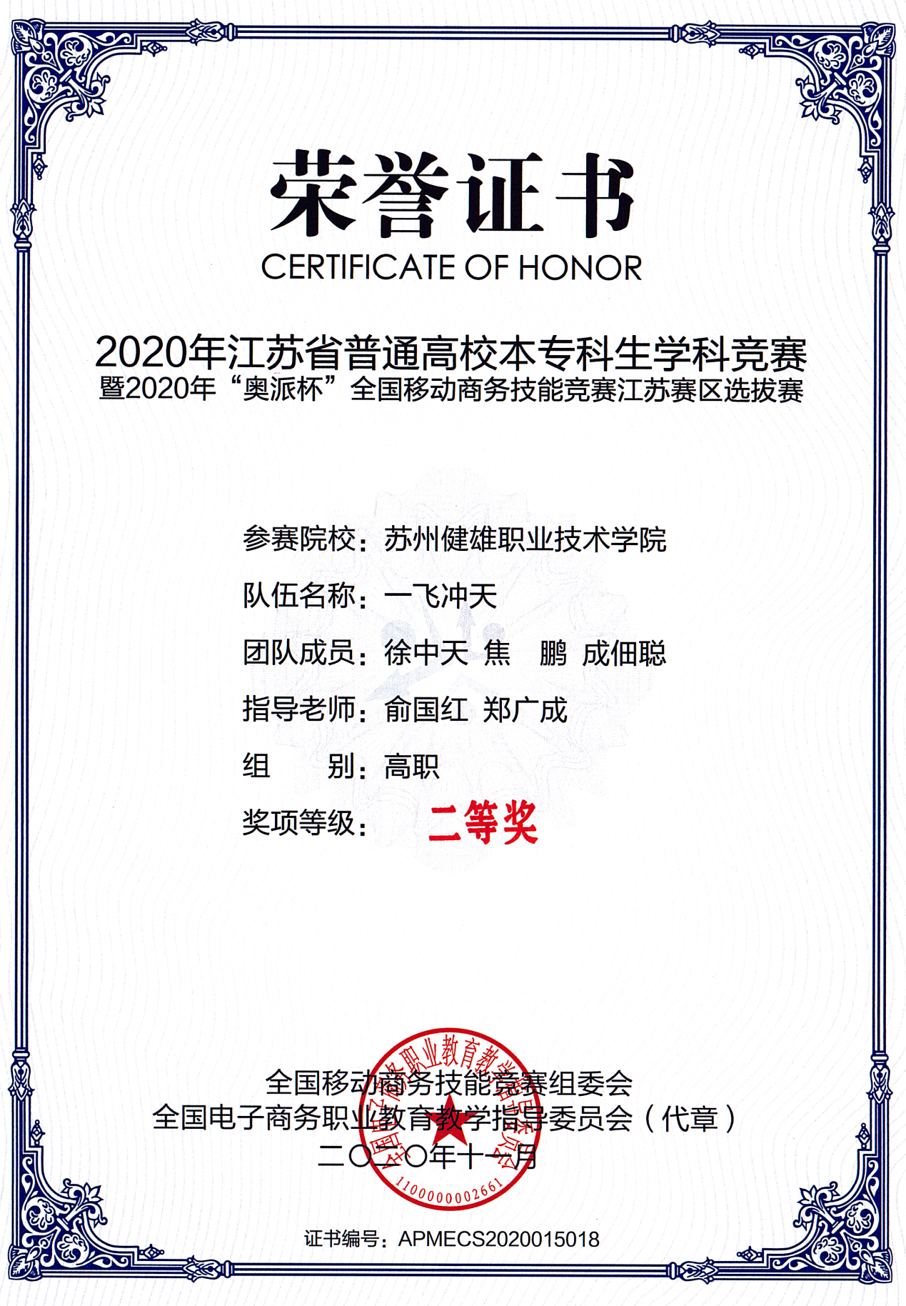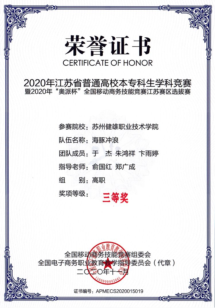 在本次比赛中,我校人工智能学院电子商务技术专业徐中天、焦鹏、成佃聪组成的“一飞冲天”队获高职组二等奖,于杰、卞雨婷、朱鸿祥组成的“海豚冲浪”队获三等奖。