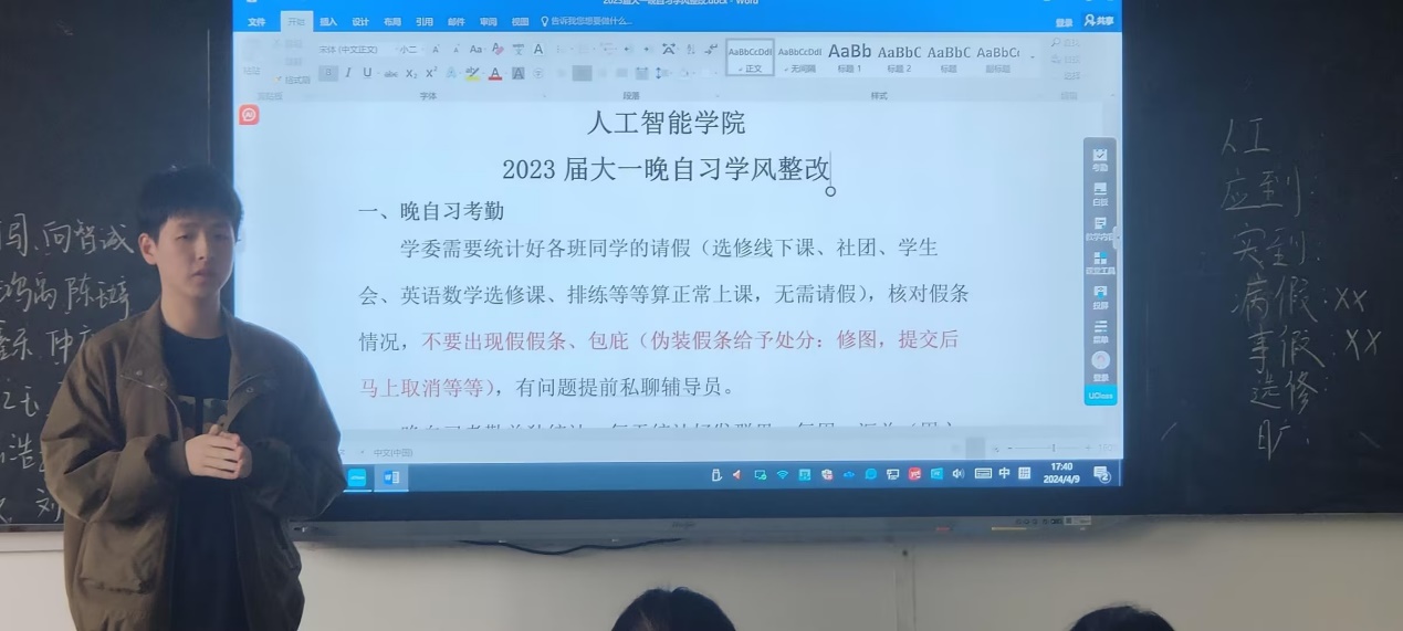 学生会负责人马英奇同学通报了各班晚自习存在的问题,宣读了《人工智能学院晚自习学风整改办法》,强调了接下来各班要从晚自习纪律抓起,带动班级学风提升,并解读了《办法》中的具体奖惩措施。学习部负责人常璐同学就如何做好学委工作进行说明,特别是要严格请假制度,严查假条真实性,及时与辅导员沟通联系。