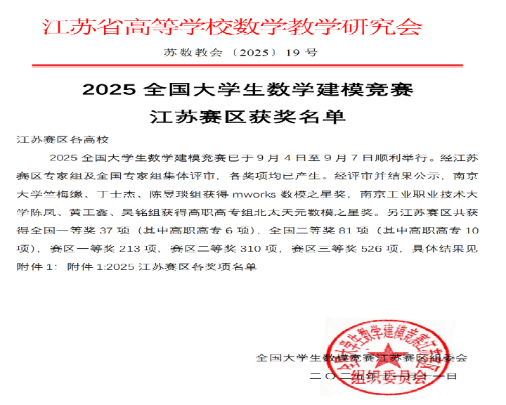 近日,2025年全国大学生数学建模竞赛成绩正式揭晓。人工智能学院学生朱嘉豪、张有康、王婷婷在刘苗苗和殷红梅老师的共同指导下,凭借扎实的专业基础与出色的团队协作,在比赛中攻坚克难,最终荣获江苏赛区一等奖。