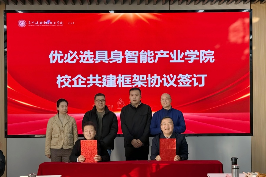 2025年11月19日上午,苏州健雄职业技术学院与深圳市优必选科技股份有限公司在人工智能学院D1-101举行校企共建协议签订仪式。优必选产教融合业务总经理李晓明、业务市场总监李伟光、资深方案专家张铁军,优奇智能人力资源总监张鑫楠,苏州简迈智能科技有限公司市场总监许晓东、解决方案经理周海龙,学院党委副书记、校长林长永,校企合作处、人工智能学院管理团队和骨干教师等参加。