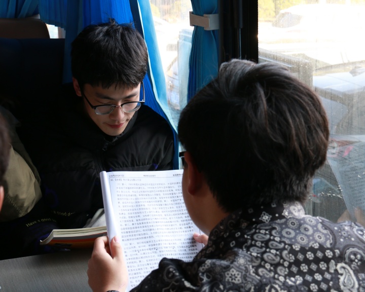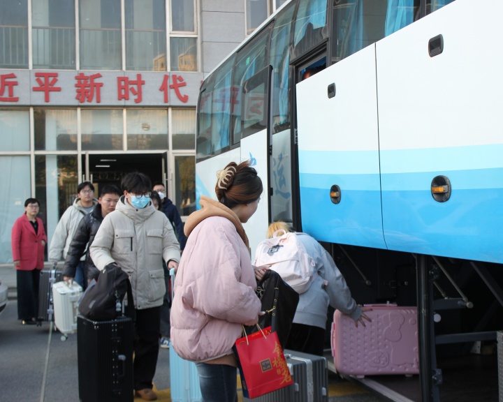 贴有“执笔为剑,披荆斩棘;以梦为马,不负韶华!”标语的送考大巴车早早的等候在图书馆北广场。学院领导、辅导员们亲自带队,为每一位考生送上临行前的祝福。出发时,车窗内外挥手致意,一句句“加油”“必胜”,这是学院对学子最真挚的期许,也是青春里最动人的奔赴。