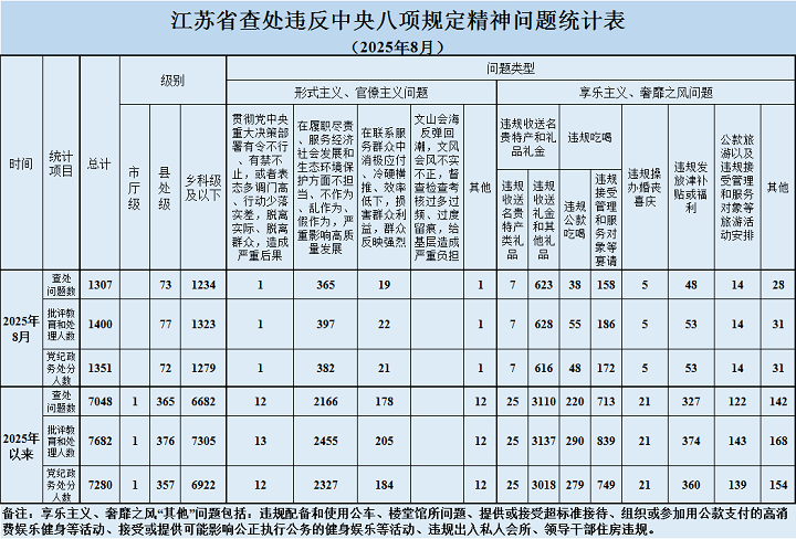 2025年8月,全省共查处违反中央八项规定精神问题1307起,批评教育和处理1400人、其中给予党纪政务处分1351人。从问题类型看,查处形式主义、官僚主义问题386起、批评教育和处理421人,查处享乐主义、奢靡之风问题921起、批评教育和处理979人。从人员级别看,批评教育和处理县处级干部77人、乡科级及以下人员1323人。
