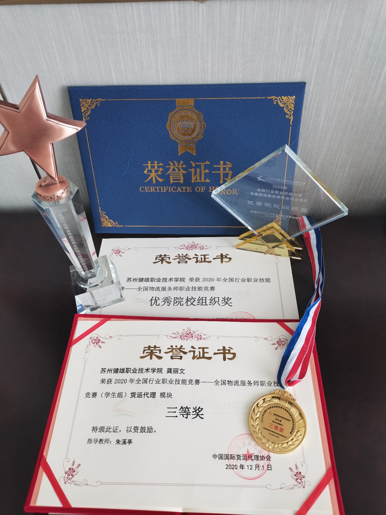 商学院物流管理专业学生龚丽文不久之前在我院承办的第三届江苏省百万技能人才技能竞赛暨2020年江苏省物流服务师技能竞赛货运代理模块(学生组)中脱颖而出,成功晋级国赛,代表江苏省参加了此次全国总决赛。作为已经开始实习工作的大三学生,龚丽文同学克服困难,在指导老师的帮助下积极备赛。她钻研业务,将专业知识和实践经验相结合,最终在角逐激烈的全国总决赛中获得了三等奖的好成绩,苏州健雄职业技术学院被大赛组委会授予“优秀院校组织奖”。