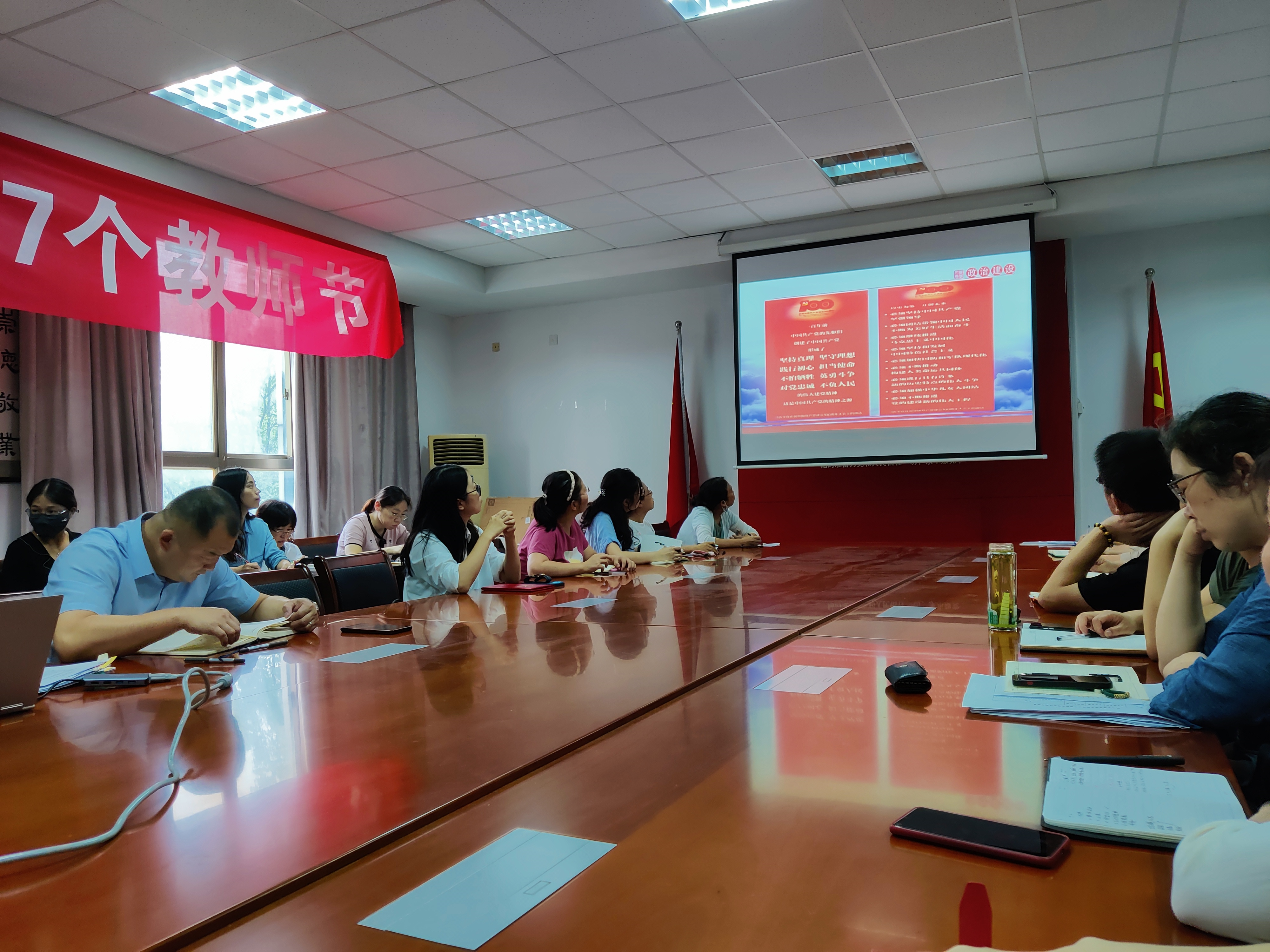 会上,全体教职工学习习近平总书记在庆祝建党一百周年大会上的讲话要点,由周丽雅副书记领学。通过学习,全体教职工再次重温这一振奋人心的讲话,中国共产党带领全国各族人民实现了全面建成小康社会的百年奋斗目标,形成并发扬了伟大建党精神,创造了新民主主义革命、社会主义革命和建设、改革开放和社会主义现代化建设、新时代中国特色社会主义四个伟大成就;在新时代,中国共产党将以史为鉴、开创未来,为实现中华民族伟大复兴的目标继续奋进。